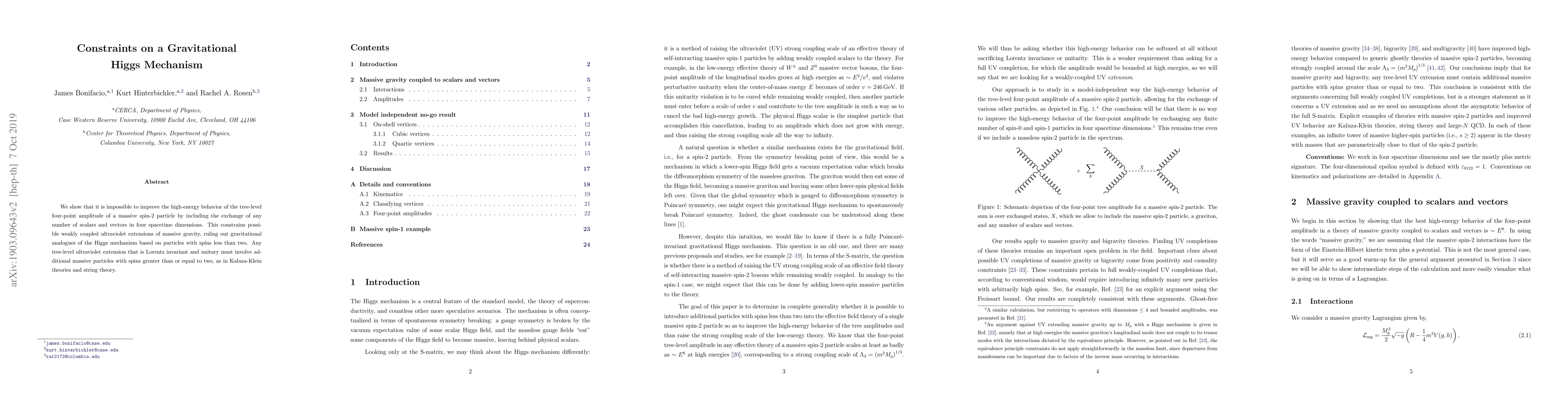 This paper demonstrates that enhancing the high-energy behavior of a massive spin-2 particle's four-point amplitude in four dimensions cannot be achieved via scalar or vector exchanges, thus ruling out gravitational Higgs mechanisms involving particles with spins less than two. It concludes that any unitary, Lorentz-invariant extension must include additional massive particles with spins greater than or equal to two.