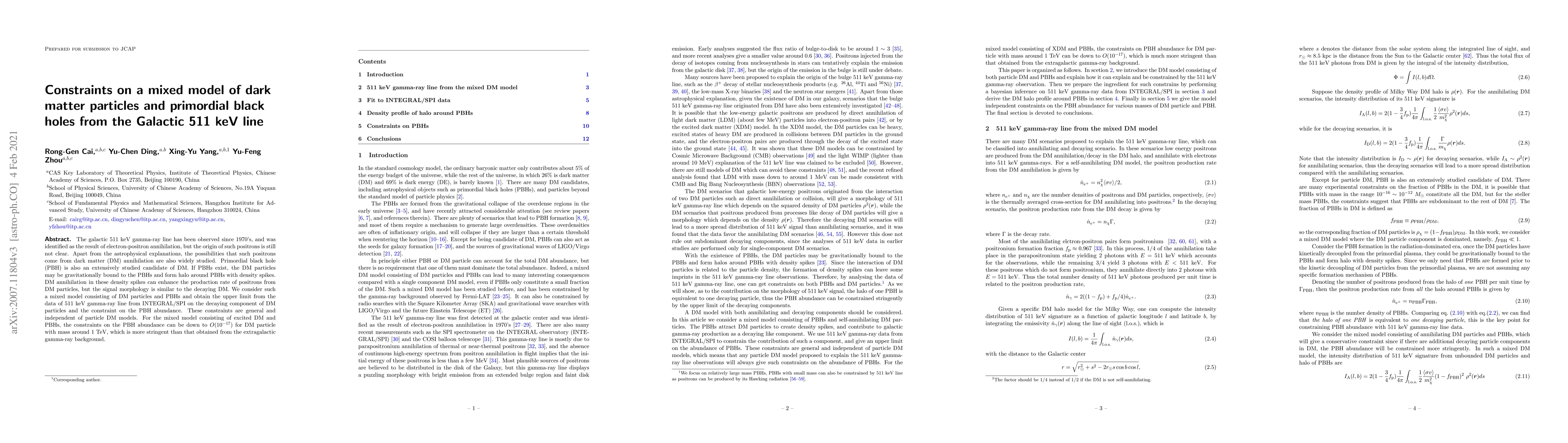 This paper investigates a mixed model of dark matter particles and primordial black holes (PBHs) to explain the Galactic 511 keV gamma-ray line, attributing the positrons to dark matter annihilation. It derives constraints on the decaying dark matter component and PBH abundance from INTEGRAL/SPI data, finding stringent limits on PBH abundance for dark matter particles around 1 TeV.