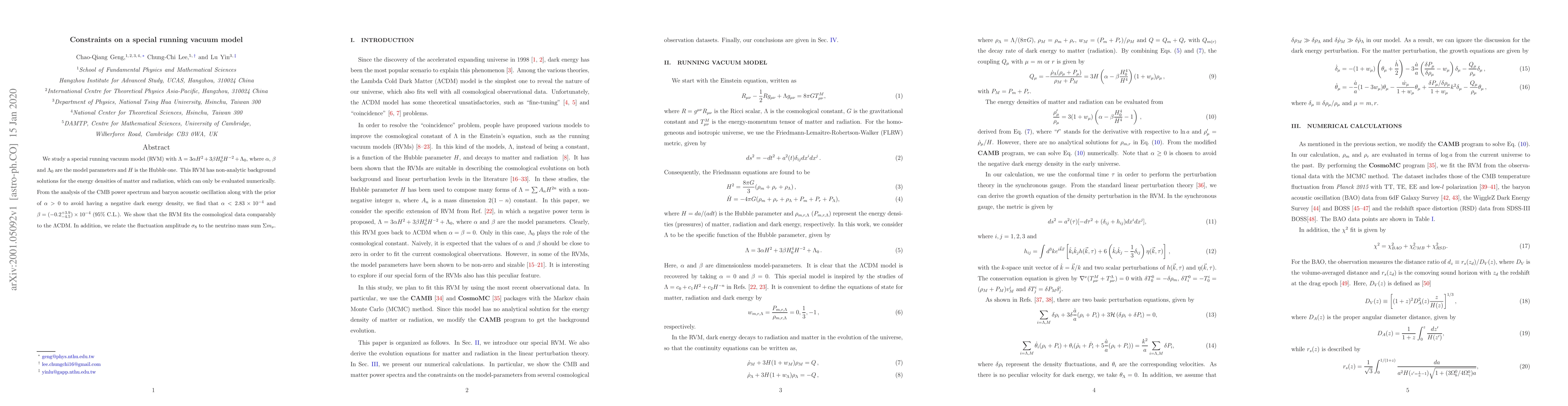 Researchers studied a special running vacuum model, finding that it fits cosmological data comparable to the LambdaCDM model, with constraints on its parameters indicating that dark energy density is positive.