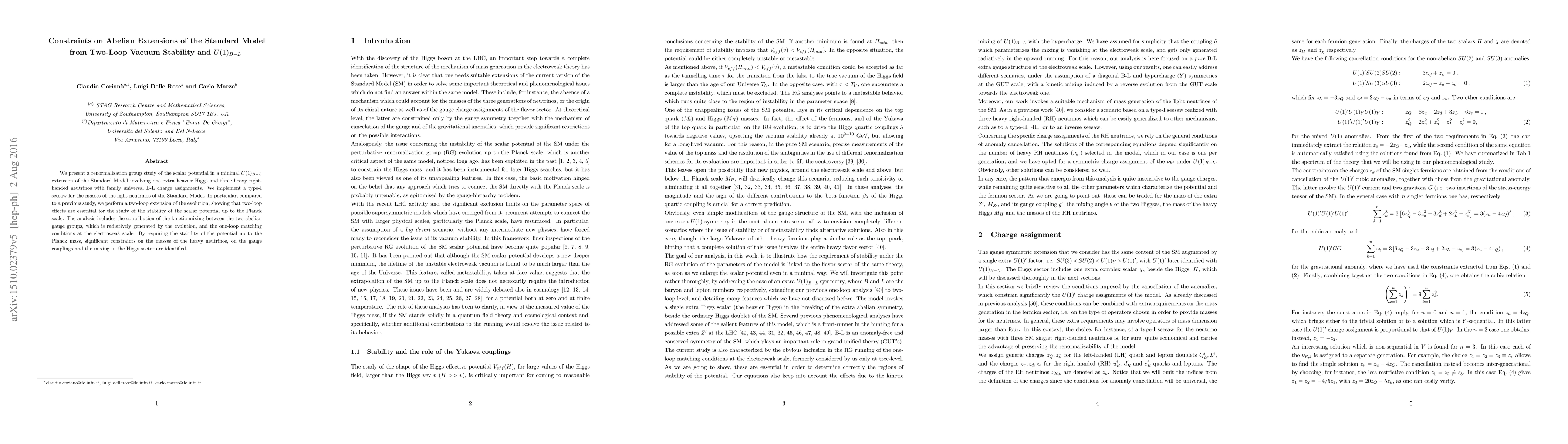 We present a renormalization group study of the scalar potential in a minimal $U(1)_{B-L}$ extension of the Standard Model involving one extra heavier Higgs and three heavy right-handed neutrinos with family universal B-L charge assignments. We implement a type-I seesaw for the masses of the light neutrinos of the Standard Model. In particular, compared to a previous study, we perform a two-loop extension of the evolution, showing that two-loop effects are essential for the study of the stability of the scalar potential up to the Planck scale. The analysis includes the contribution of the kinetic mixing between the two abelian gauge groups, which is radiatively generated by the evolution, and the one-loop matching conditions at the electroweak scale. By requiring the stability of the potential up to the Planck mass, significant constraints on the masses of the heavy neutrinos, on the gauge couplings and the mixing in the Higgs sector are identified.