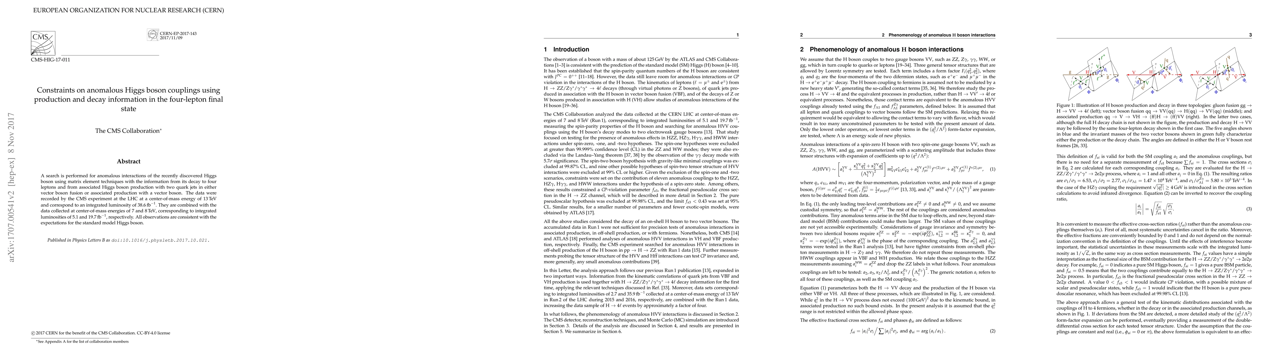 A search is performed for anomalous interactions of the recently discovered Higgs boson using matrix element techniques with the information from its decay to four leptons and from associated Higgs boson production with two quark jets in either vector boson fusion or associated production with a vector boson. The data were recorded by the CMS experiment at the LHC at a center-of-mass energy of 13 TeV and correspond to an integrated luminosity of 38.6 inverse femtobarns. These data are combined with the data collected at center-of-mass energies of 7 and 8 TeV, corresponding to integrated luminosities of 5.1 and 19.7 inverse femtobarns, respectively. All observations are consistent with the expectations for the standard model Higgs boson.