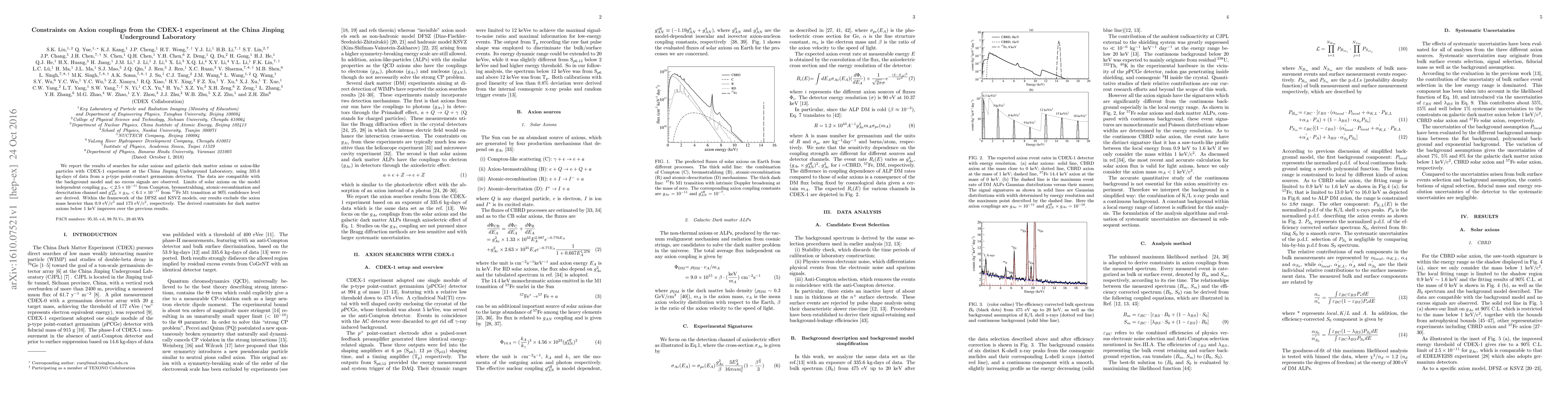 The CDEX-1 experiment at China Jinping Underground Laboratory sets new limits on the couplings of solar and galactic dark matter axions, excluding axion masses above 0.9 eV/c² for the DFSZ model and 173 eV/c² for the KSVZ model, and improving constraints on dark matter axions below 1 keV. No excess signals were observed, consistent with the background model.
