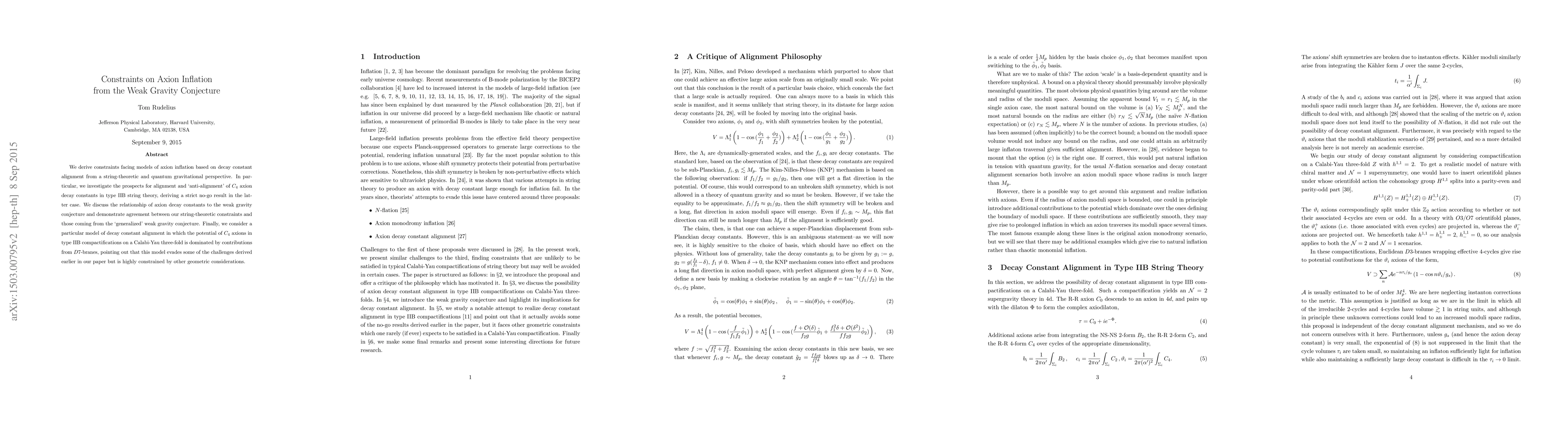 We derive constraints facing models of axion inflation based on decay constant alignment from a string-theoretic and quantum gravitational perspective. In particular, we investigate the prospects for alignment and `anti-alignment' of $C_4$ axion decay constants in type IIB string theory, deriving a strict no-go result in the latter case. We discuss the relationship of axion decay constants to the weak gravity conjecture and demonstrate agreement between our string-theoretic constraints and those coming from the `generalized' weak gravity conjecture. Finally, we consider a particular model of decay constant alignment in which the potential of $C_4$ axions in type IIB compactifications on a Calabi-Yau three-fold is dominated by contributions from $D7$-branes, pointing out that this model evades some of the challenges derived earlier in our paper but is highly constrained by other geometric considerations.