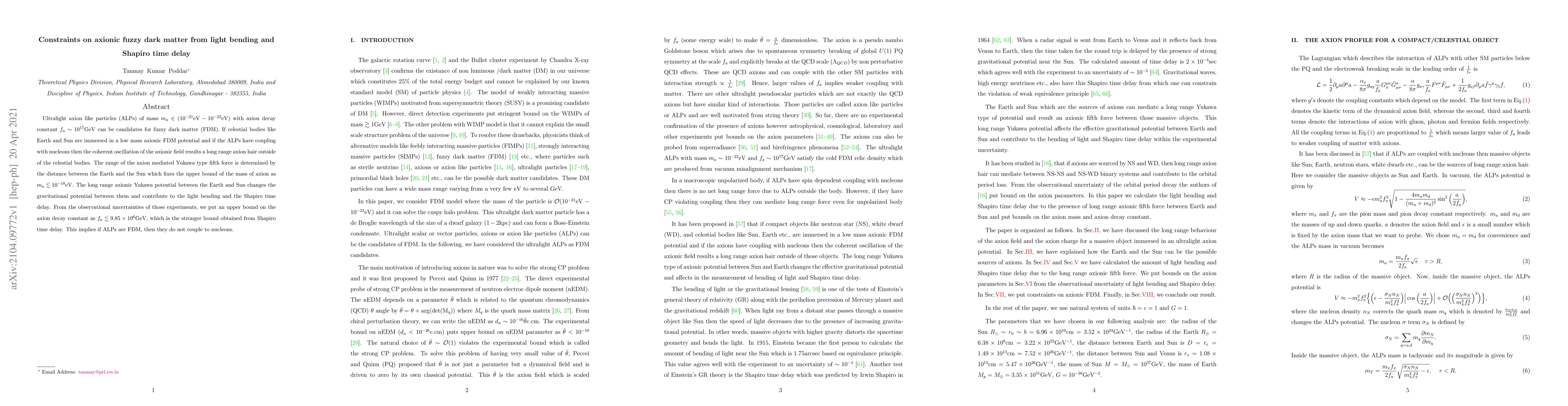 Researchers find that ultralight axion-like particles, potentially making up fuzzy dark matter, have a mass limit of around 10^-18 eV and decay constant of less than 9.85 x 10^6 GeV due to constraints from light bending and Shapiro time delay.