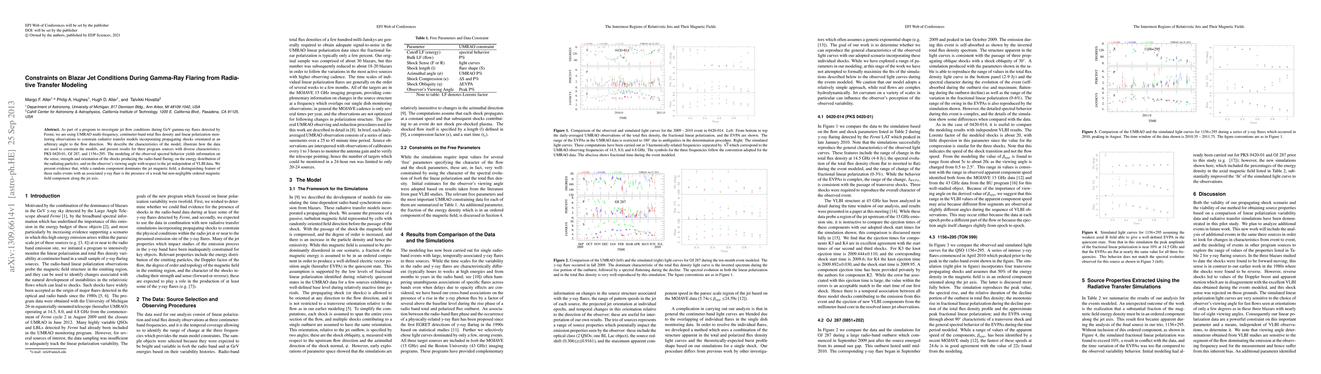 As part of a program to investigate jet flow conditions during GeV gamma-ray flares detected by Fermi, we are using UMRAO multi-frequency, centimeter-band total flux density and linear polarization monitoring observations to constrain radiative transfer models incorporating propagating shocks orientated at an arbitrary angle to the flow direction. We describe the characteristics of the model, illustrate how the data are used to constrain the models, and present results for three program sources with diverse characteristics: PKS 0420-01, OJ 287, and 1156+295. The modeling of the observed spectral behavior yields information on the sense, strength and orientation of the shocks producing the radio-band flaring; on the energy distribution of the radiating particles; and on the observer's viewing angle with respect to the jet independent of VLBI data. We present evidence that, while a random component dominates the jet magnetic field, a distinguishing feature of those radio events with an associated gamma-ray flare is the presence of a weak but non-negligible ordered magnetic field component along the jet axis.