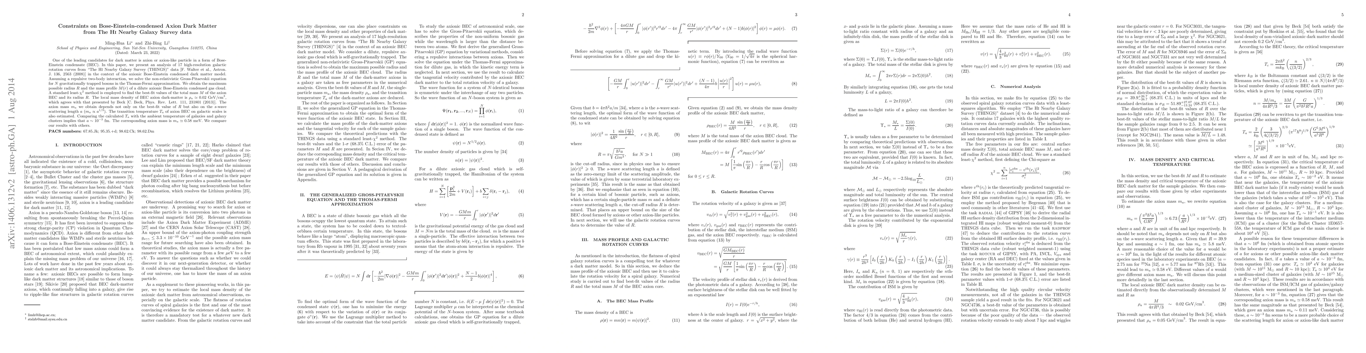 One of the leading candidates for dark matter is axion or axion-like particle in a form of Bose-Einstein condensate (BEC). In this paper, we present an analysis of 17 high-resolution galactic rotation curves from "The H{\footnotesize I} Nearby Galaxy Survey (THINGS)" data [F. Walter et al., Astron. J. 136, 2563 (2008)] in the context of the axionic Bose-Einstein condensed dark matter model. Assuming a repulsive two-body interaction, we solve the non-relativistic Gross-Pitaevskii equation for $N$ gravitationally trapped bosons in the Thomas-Fermi approximation. We obtain the maximum possible radius $R$ and the mass profile $M(r)$ of a dilute axionic Bose-Einstein condensed gas cloud. A standard least-$\chi^2$ method is employed to find the best-fit values of the total mass $M$ of the axion BEC and its radius $R$. The local mass density of BEC axion dark-matter is $\rho_{a}\simeq 0.02~{\rm GeV/cm}^3$, which agrees with that presented by Beck [C. Beck, Phys. Rev. Lett. 111, 231801 (2013)]. The axion mass $m_a$ we obtain depends not only on the best-fit value of $R$ but also on the $s$-wave scattering length $a$ ($m_a \propto a^{1/3}$). The transition temperature $T_a$ of axion BEC on galactic scales is also estimated. Comparing the calculated $T_a$ with the ambient temperature of galaxies and galaxy clusters implies that $a\sim 10^{-3}$ fm. The corresponding axion mass is $m_a\simeq 0.58$ meV. We compare our results with others.