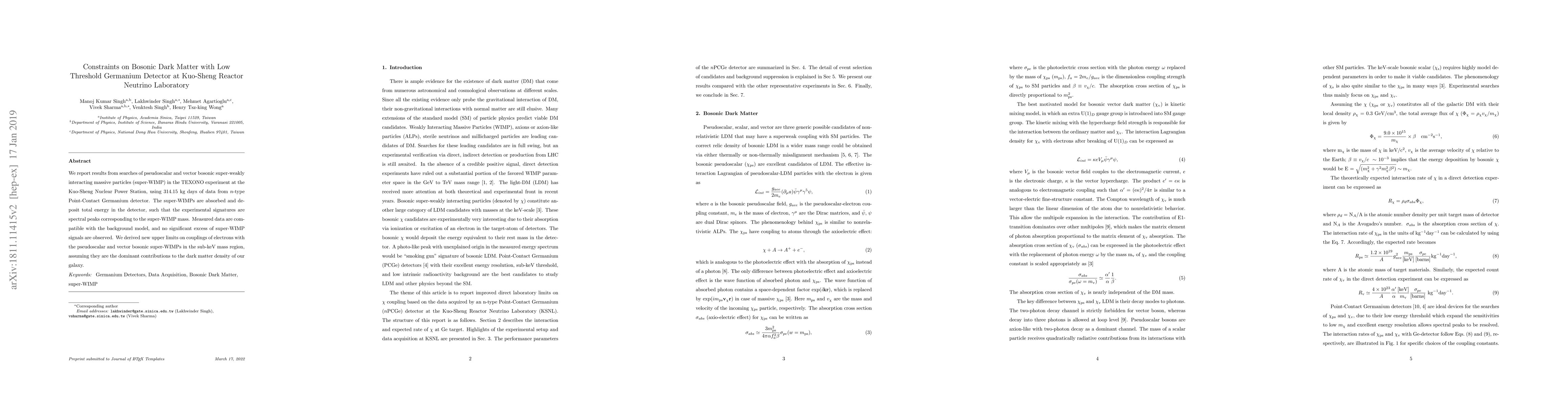The TEXONO experiment at Kuo-Sheng Reactor Neutrino Laboratory used low-threshold germanium detectors to search for pseudoscalar and vector bosonic super-WIMPs, finding no significant excess signals. New upper limits on the couplings of electrons with these particles in the sub-keV mass region were established.