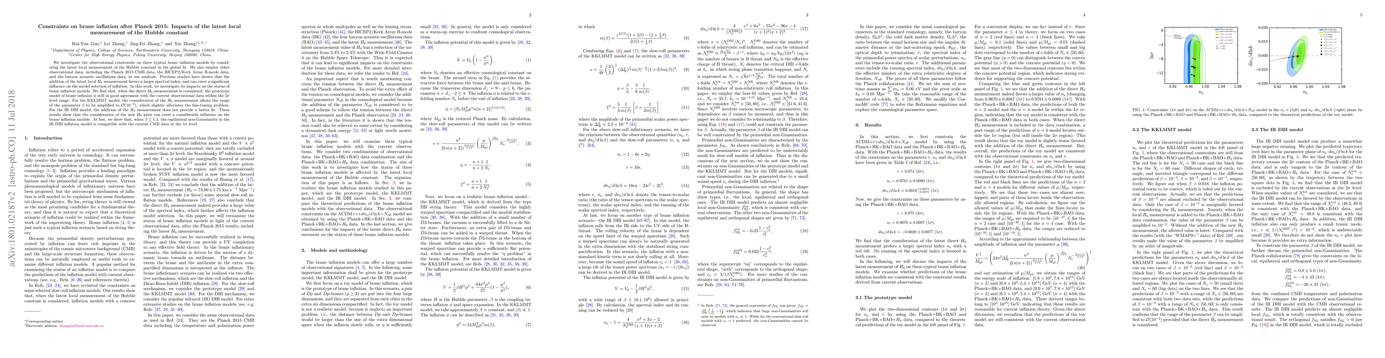 We investigate the observational constraints on three typical brane inflation models by considering the latest local measurement of the Hubble constant in the global fit. We also employ other observational data, including the Planck 2015 CMB data, the BICEP2/Keck Array B-mode data, and the baryon acoustic oscillations data, in our analysis. Previous studies have shown that the addition of the latest local $H_{0}$ measurement favors a larger spectral index, and can exert a significant influence on the model selection of inflation. In this work, we investigate its impacts on the status of brane inflation models. We find that, when the direct $H_{0}$ measurement is considered, the prototype model of brane inflation is still in good agreement with the current observational data within the $2\sigma$ level range. For the KKLMMT model, the consideration of the $H_{0}$ measurement allows the range of the parameter $\beta$ to be amplified to ${\cal O}(10^{-2})$, which slightly alleviates the fine-tuning problem. For the IR DBI model, the addition of the $H_{0}$ measurement does not provide a better fit. These results show that the consideration of the new $H_{0}$ prior can exert a considerable influence on the brane inflation models. At last, we show that, when $\beta \lesssim 1.1$, the equilateral non-Gaussianity in the IR DBI inflation model is compatible with the current CMB data at the 1$\sigma$ level.