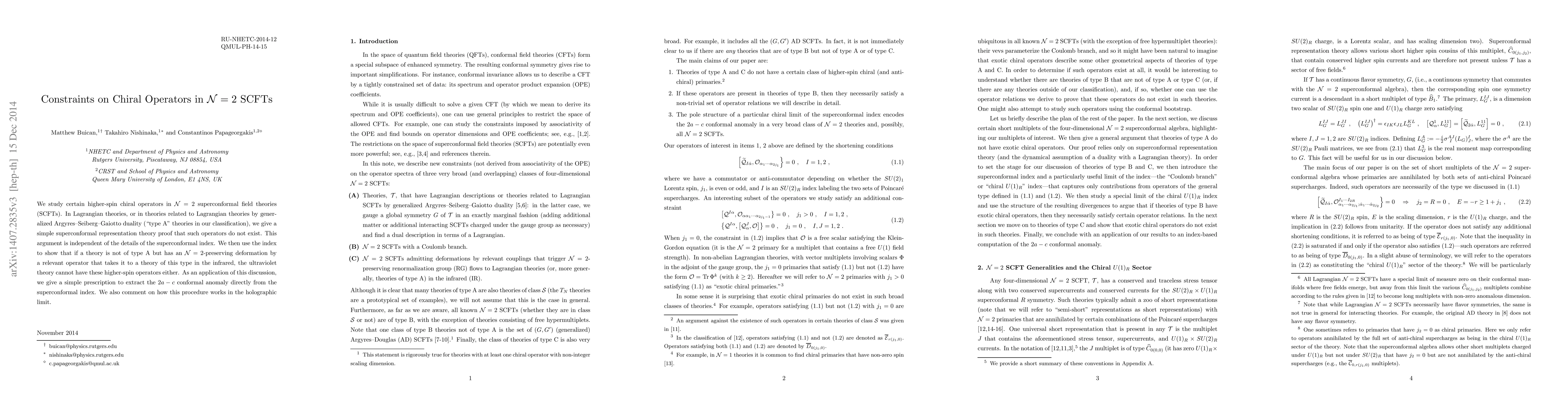 We study certain higher-spin chiral operators in N=2 superconformal field theories (SCFTs). In Lagrangian theories, or in theories related to Lagrangian theories by generalized Argyres-Seiberg-Gaiotto duality ("type A" theories in our classification), we give a simple superconformal representation theory proof that such operators do not exist. This argument is independent of the details of the superconformal index. We then use the index to show that if a theory is not of type A but has an N=2-preserving deformation by a relevant operator that takes it to a theory of this type in the infrared, the ultraviolet theory cannot have these higher-spin operators either. As an application of this discussion, we give a simple prescription to extract the 2a-c conformal anomaly directly from the superconformal index. We also comment on how this procedure works in the holographic limit.