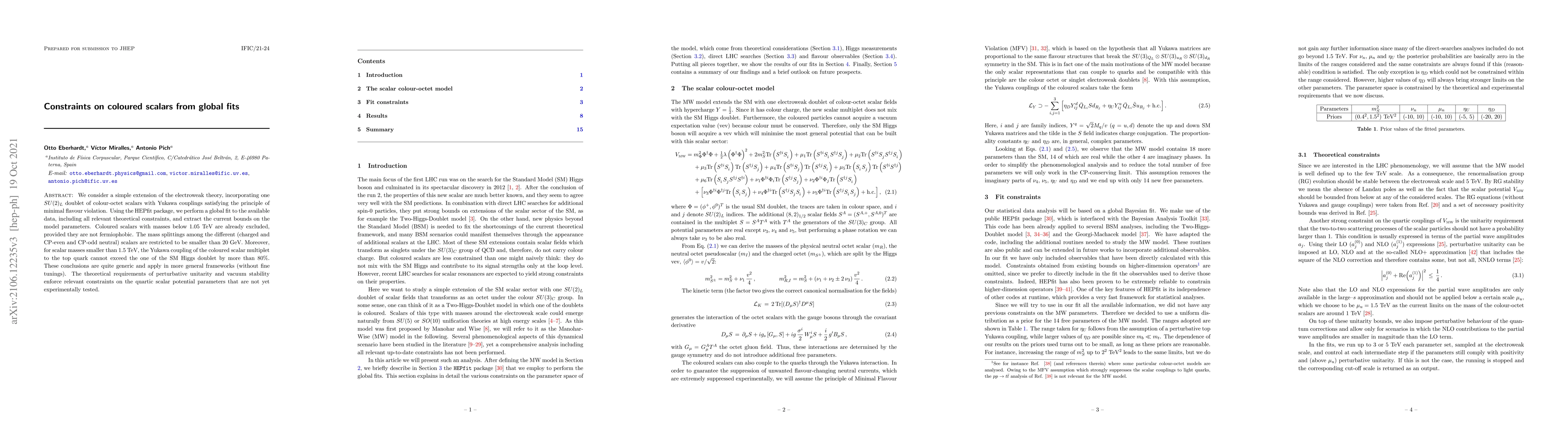 This paper extends the electroweak theory with colour-octet scalars and performs a global fit to derive constraints on these new particles. It finds that coloured scalars below 1.05 TeV are excluded unless they are fermiophobic, and mass splittings among different scalars are limited to less than 20 GeV.