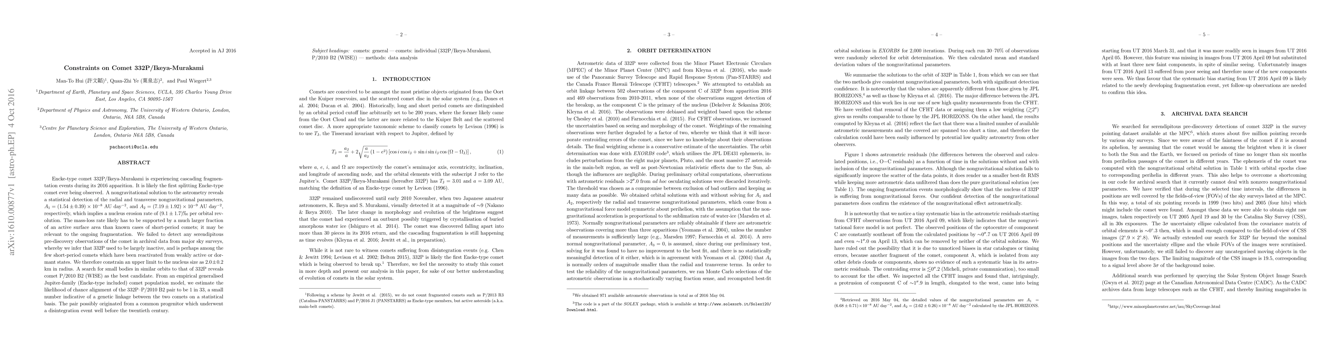 Encke-type comet 332P/Ikeya-Murakami is experiencing cascading fragmentation events during its 2016 apparition. It is likely the first splitting Encke-type comet ever being observed. A nongravitational solution to the astrometry reveals a statistical detection of the radial and transverse nongravitational parameters, $A_{1} = \left(1.54 \pm 0.39\right) \times 10^{-8}$ AU day$^{-2}$, and $A_{2} = \left(7.19 \pm 1.92\right) \times 10^{-9}$ AU day$^{-2}$, respectively, which implies a nucleus erosion rate of $\left(0.91 \pm 0.17\right)$% per orbital revolution. The mass-loss rate likely has to be supported by a much larger fraction of an active surface area than known cases of short-period comets; it may be relevant to the ongoing fragmentation. We failed to detect any serendipitous pre-discovery observations of the comet in archival data from major sky surveys, whereby we infer that 332P used to be largely inactive, and is perhaps among the few short-period comets which have been reactivated from weakly active or dormant states. We therefore constrain an upper limit to the nucleus size as $2.0 \pm 0.2$ km in radius. A search for small bodies in similar orbits to that of 332P reveals comet P/2010 B2 (WISE) as the best candidate. From an empirical generalised Jupiter-family (Encke-type included) comet population model, we estimate the likelihood of chance alignment of the 332P--P/2010 B2 pair to be 1 in 33, a small number indicative of a genetic linkage between the two comets on a statistical basis. The pair possibly originated from a common progenitor which underwent a disintegration event well before the twentieth century.