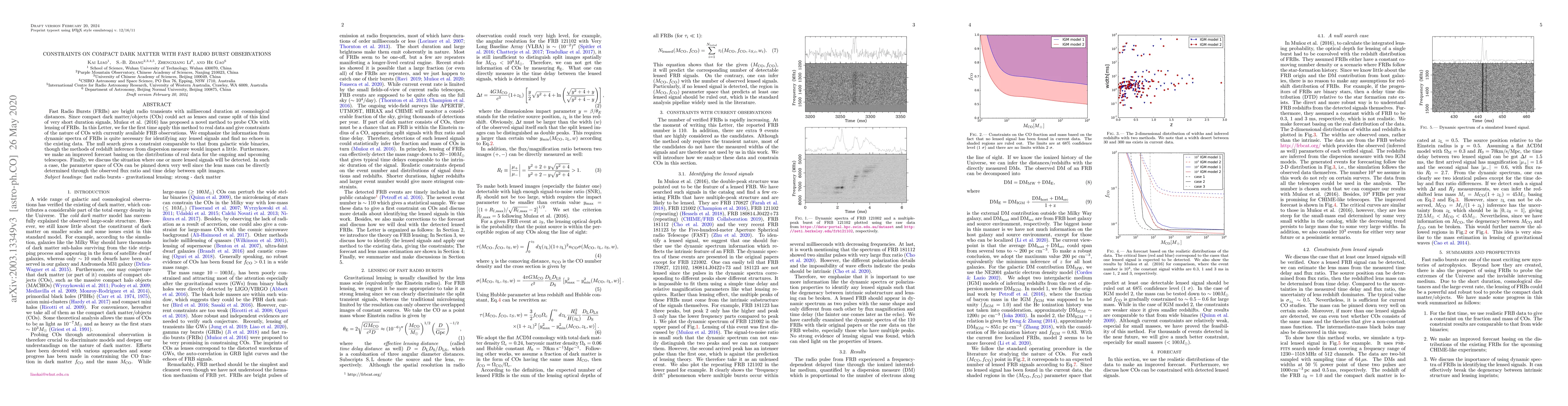 This paper applies a novel method using Fast Radio Bursts (FRBs) to probe compact dark matter objects (COs) through their lensing effects, finding no lensed signals in current data but providing constraints comparable to galactic wide binaries. It forecasts improved detections with future telescopes and discusses how detected lensed signals could precisely determine CO parameters.