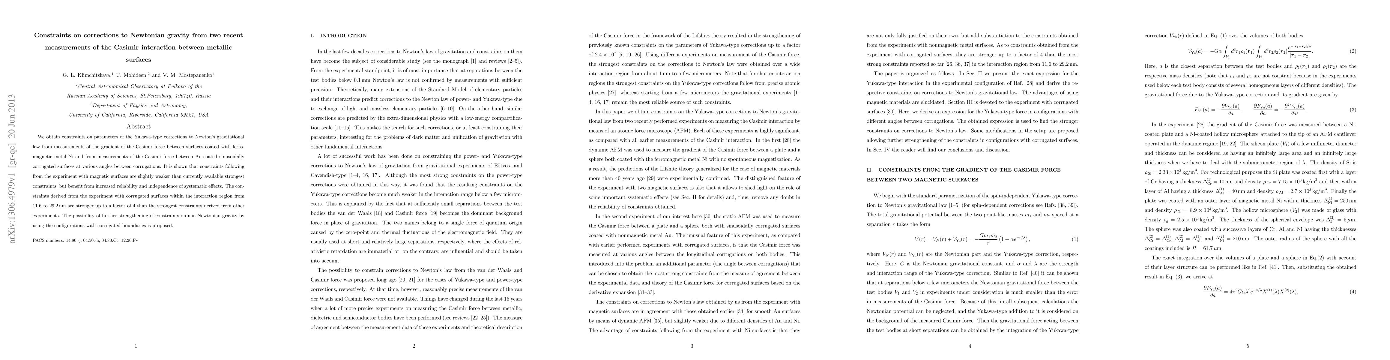 This paper provides new constraints on Yukawa-type corrections to Newtonian gravity using measurements of the Casimir force between metallic surfaces, showing that experiments with corrugated surfaces yield stronger constraints by up to a factor of 4 compared to previous results.