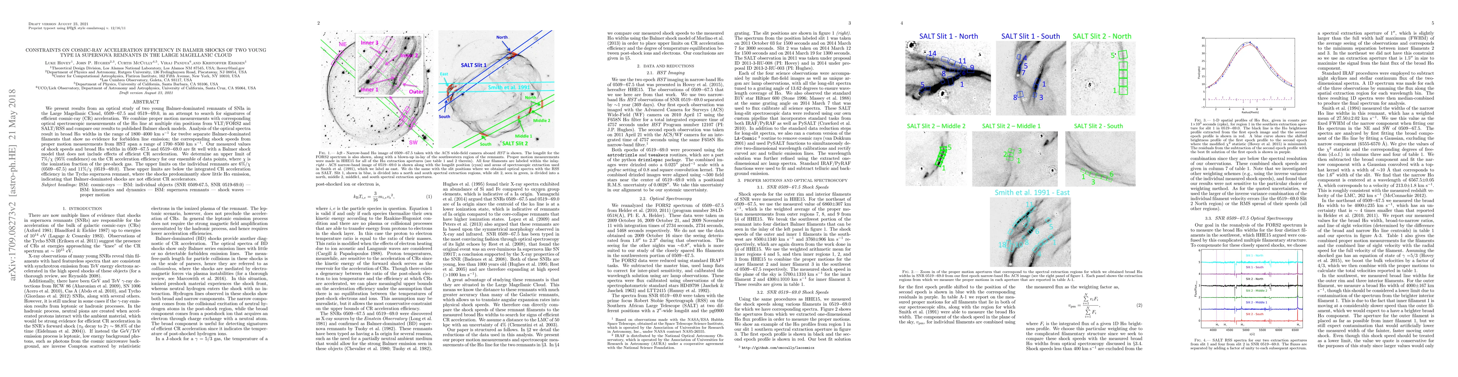 We present results from an optical study of two young Balmer-dominated remnants of SNIa in the Large Magellanic Cloud, 0509$-$67.5 and 0519$-$69.0, in an attempt to search for signatures of efficient cosmic-ray (CR) acceleration. We combine proper motion measurements from HST with corresponding optical spectroscopic measurements of the H$\alpha$ line at multiple rim positions from VLT/FORS2 and SALT/RSS and compare our results to published Balmer shock models. Analysis of the optical spectra result in broad H$\alpha$ widths in the range of 1800-4000 km s$^{-1}$ for twelve separate Balmer-dominated filaments that show no evidence for forbidden line emission, the corresponding shock speeds from proper motion measurements span a range of 1700-8500 km s$^{-1}$. Our measured values of shock speeds and broad H$\alpha$ widths in 0509$-$67.5 and 0519$-$69.0 are fit well with a Balmer shock model that does not include effects of efficient CR acceleration. We determine an upper limit of 7%/$\chi$ (95% confidence) on the CR acceleration efficiency for our ensemble of data points, where $\chi$ is the ionization fraction of the pre-shock gas. The upper limits on the individual remnants are 6%/$\chi$ (0509$-$67.5) and 11%/$\chi$ (0519$-$69.0). These upper limits are below the integrated CR acceleration efficiency in the Tycho supernova remnant, where the shocks predominantly show little H$\alpha$ emission, indicating that Balmer-dominated shocks are not efficient CR accelerators.