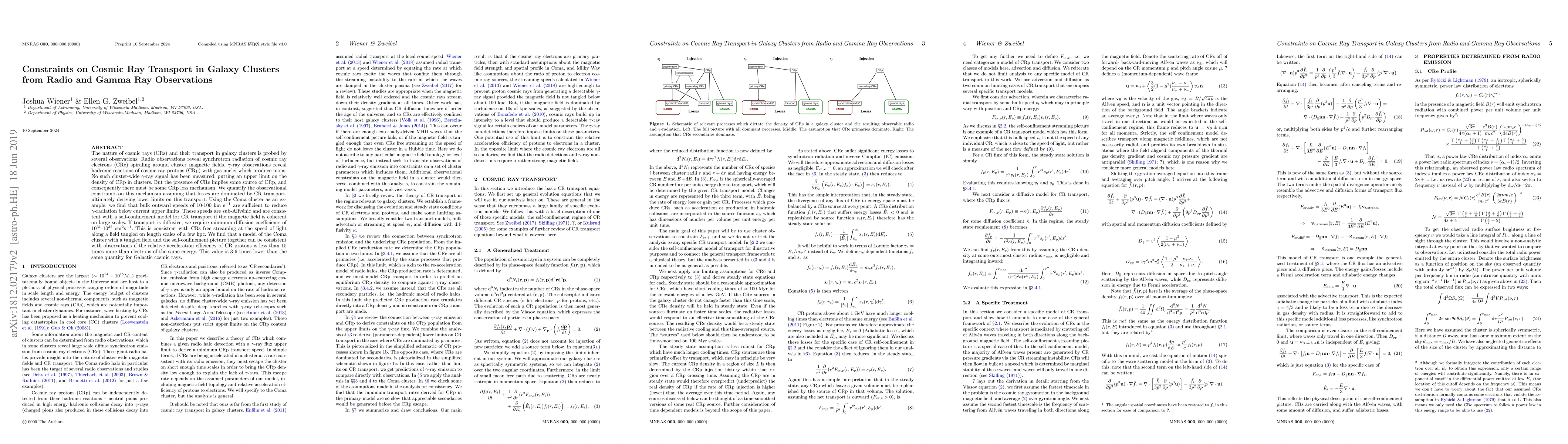 The research analyzes cosmic ray transport in galaxy clusters using radio and gamma-ray observations, deriving constraints on diffusion coefficients and proton-to-electron acceleration efficiency.