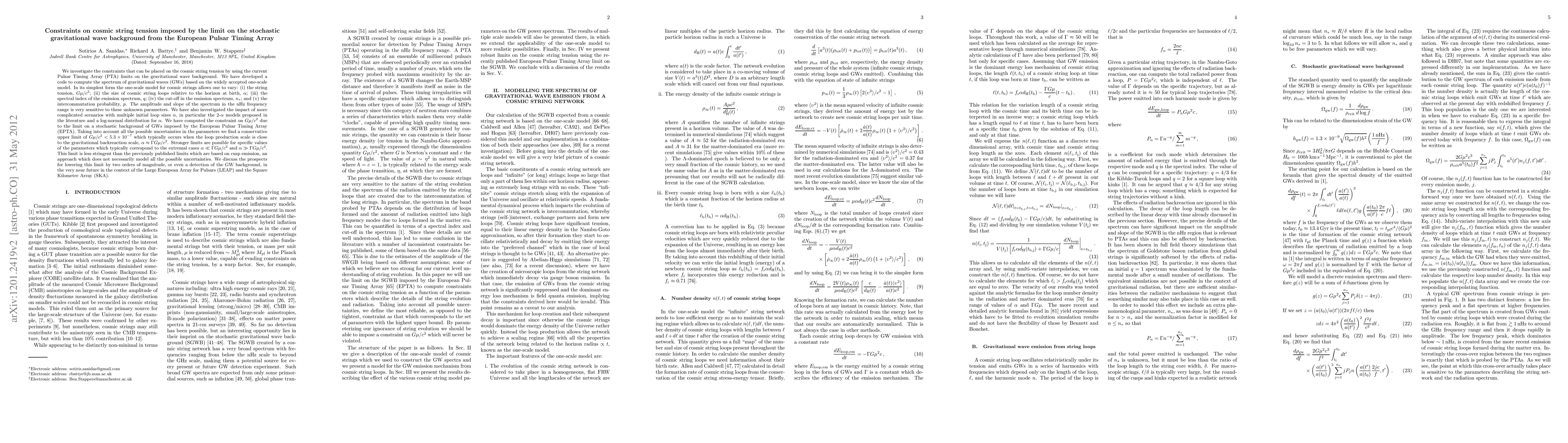 This research uses current limits on stochastic gravitational wave background (SGWB) from the European Pulsar Timing Array to constrain cosmic string tension. By modeling the GW spectrum with one-scale and more complex models, the study finds a conservative upper limit of Gmu/c^2<5.3x 10^{-7}. The limit is sensitive to parameters like loop size at birth, spectral index, and emission cut-off. Future arrays like the Large European Array for Pulsars and the Square Kilometre Array could potentially improve this limit or even detect the SGWB.