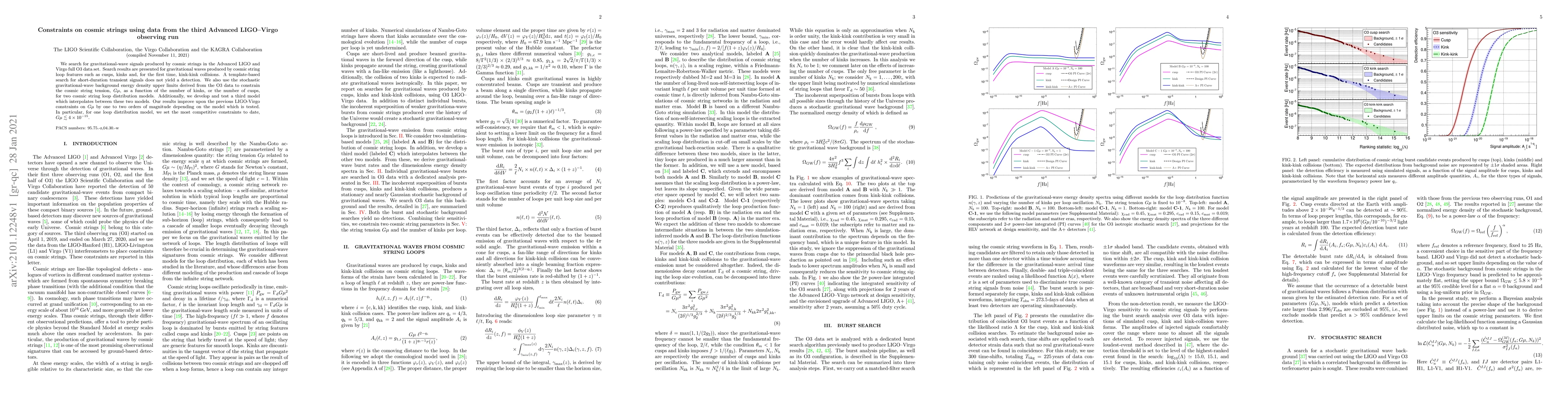 We search for gravitational-wave signals produced by cosmic strings in the Advanced LIGO and Virgo full O3 data set. Search results are presented for gravitational waves produced by cosmic string loop features such as cusps, kinks and, for the first time, kink-kink collisions.cA template-based search for short-duration transient signals does not yield a detection. We also use the stochastic gravitational-wave background energy density upper limits derived from the O3 data to constrain the cosmic string tension, $G\mu$, as a function of the number of kinks, or the number of cusps, for two cosmic string loop distribution models.cAdditionally, we develop and test a third model which interpolates between these two models. Our results improve upon the previous LIGO-Virgo constraints on $G\mu$ by one to two orders of magnitude depending on the model which is tested. In particular, for one loop distribution model, we set the most competitive constraints to date, $G\mu\lesssim 4\times 10^{-15}$.
