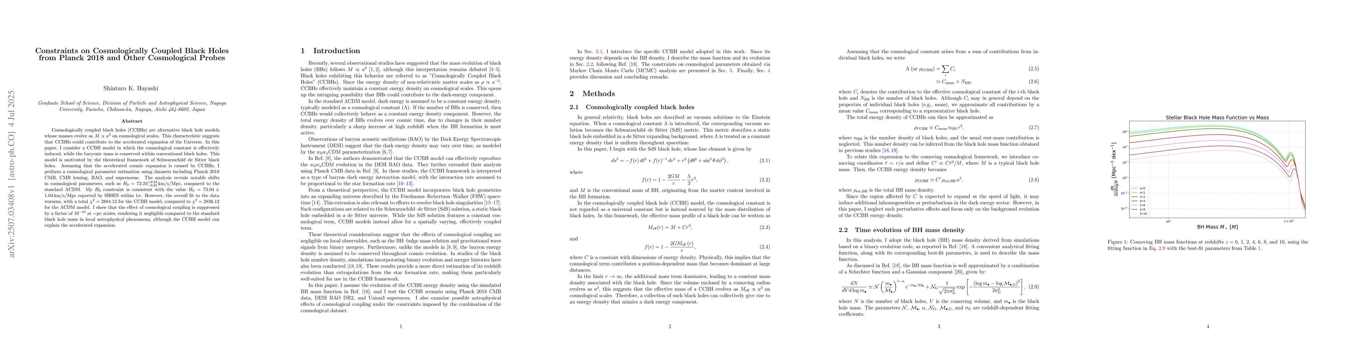 Cosmologically coupled black holes (CCBHs) are alternative black hole models whose masses evolve as $M \propto a^3$ on cosmological scales. This characteristic suggests that CCBHs could contribute to the accelerated expansion of the Universe. In this paper, I consider a CCBH model in which the cosmological constant is effectively induced, while the baryonic mass is conserved within conventional black holes. This model is motivated by the theoretical framework of Schwarzschild - de Sitter black holes. Assuming that the accelerated cosmic expansion is caused by CCBHs, I perform a cosmological parameter estimation using datasets including Planck 2018 CMB, CMB lensing, BAO, and supernovae. The analysis reveals notable shifts in cosmological parameters, such as $H_0 = 72.24^{+0.34}_{-0.35} \mathrm{km/s/Mpc}$, compared to the standard $\Lambda \mathrm{CDM}$. My $H_0$ constraint is consistent with the value $H_0 = 73.04 \pm 1.04 \mathrm{km/s/Mpc}$ reported by SH0ES within $1 \sigma$. However, the overall fit to the data worsens, with a total $\chi^2 = 2884.12$ for the CCBH model, compared to $\chi^2 = 2836.12$ for the $\Lambda$CDM model. I show that the effect of cosmological coupling is suppressed by a factor of $10^{-16}$ at $\sim$pc scales, rendering it negligible compared to the standard black hole mass in local astrophysical phenomena, although the CCBH model can explain the accelerated expansion.