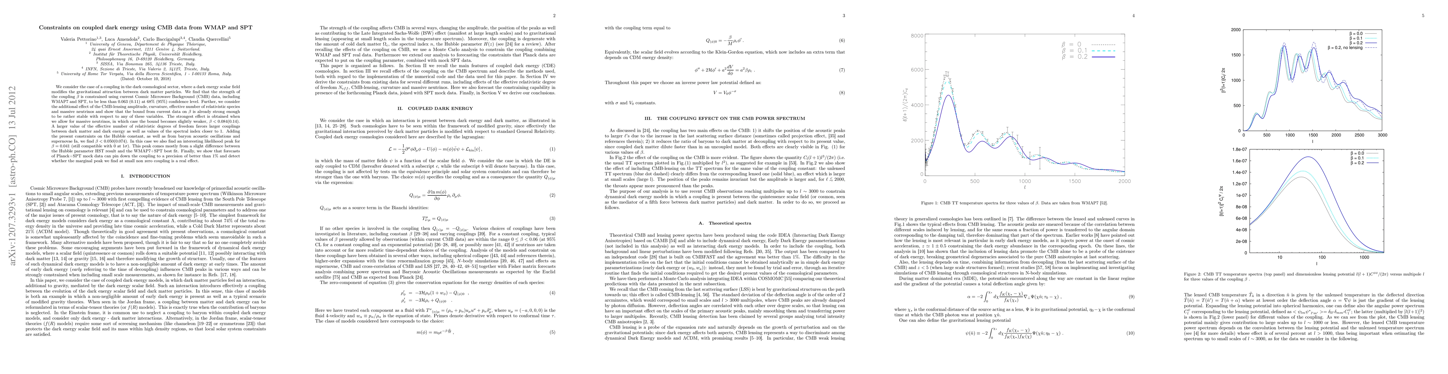 We consider the case of a coupling in the dark cosmological sector, where a dark energy scalar field modifies the gravitational attraction between dark matter particles. We find that the strength of the coupling {\beta} is constrained using current Cosmic Microwave Background (CMB) data, including WMAP7 and SPT, to be less than 0.063 (0.11) at 68% (95%) confidence level. Further, we consider the additional effect of the CMB-lensing amplitude, curvature, effective number of relativistic species and massive neutrinos and show that the bound from current data on {\beta} is already strong enough to be rather stable with respect to any of these variables. The strongest effect is obtained when we allow for massive neutrinos, in which case the bound becomes slightly weaker, {\beta} < 0.084(0.14). A larger value of the effective number of relativistic degrees of freedom favors larger couplings between dark matter and dark energy as well as values of the spectral index closer to 1. Adding the present constraints on the Hubble constant, as well as from baryon acoustic oscillations and supernovae Ia, we find {\beta} < 0.050(0.074). In this case we also find an interesting likelihood peak for {\beta} = 0.041 (still compatible with 0 at 1{\sigma}). This peak comes mostly from a slight difference between the Hubble parameter HST result and the WMAP7+SPT best fit. Finally, we show that forecasts of Planck+SPT mock data can pin down the coupling to a precision of better than 1% and detect whether the marginal peak we find at small non zero coupling is a real effect.
