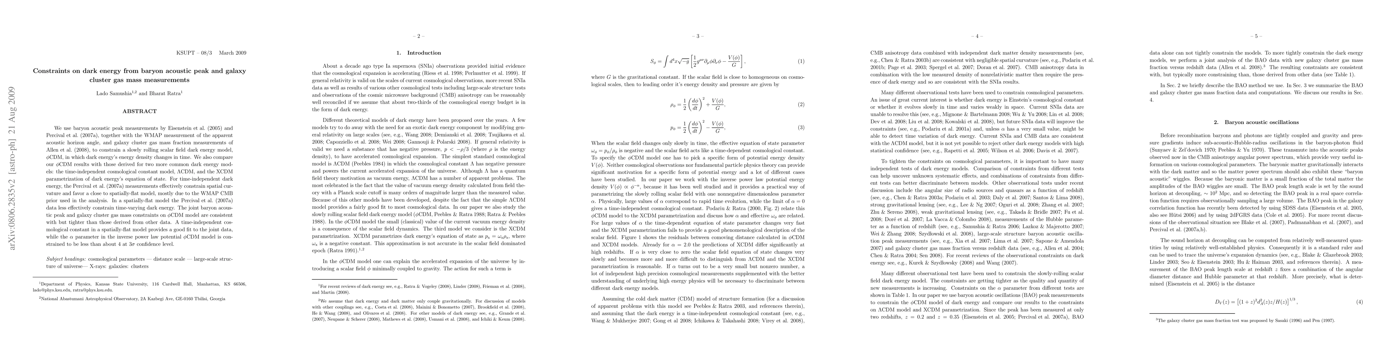 This paper uses baryon acoustic peak and galaxy cluster gas mass measurements to constrain dark energy models, finding that time-independent dark energy, particularly a cosmological constant, fits the data well, while slowly-evolving dark energy remains a viable option.