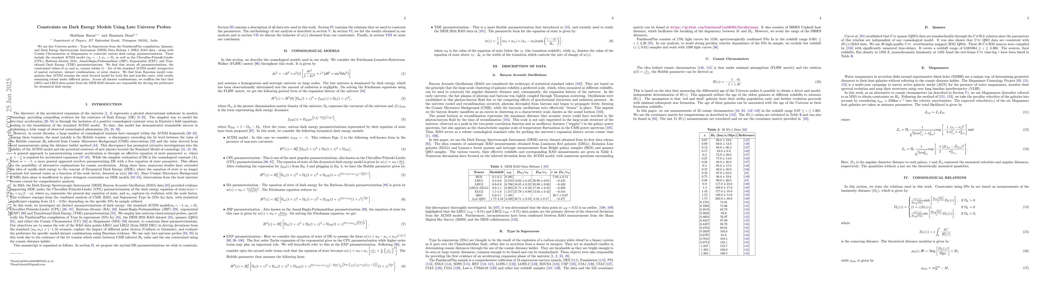 We use late Universe probes - Type Ia Supernovae from the PantheonPlus compilation, Quasars, and Dark Energy Spectroscopic Instrument (DESI) Data Release 1 (DR1) BAO data - along with Cosmic Chronometers or Megamasers to constrain various dark energy parameterizations. These include the standard $\Lambda$CDM model ($w_0=-1,w_a=0$), as well as the Chevallier-Polarski-Linder (CPL), Barboza-Alcaniz (BA), Jassal-Bagla-Padmanabhan (JBP), Exponential (EXP), and Transitional Dark Energy (TDE) parameterizations. We find that across all parameterizations, the constrained values of $w_0$ and $w_a$ remain within $(1-2)\sigma$ of the standard $\Lambda$CDM model, irrespective of spatial curvature, dataset combinations, or prior choices. We find from Bayesian model comparison that $\Lambda$CDM remains the most favored model for both flat and non-flat cases, with results remaining robust under different priors. Across all dataset combinations, we reaffirm the fact that LRG1 and LRG2 data points from the DESI BAO dataset are responsible for driving the preference for dynamical dark energy.
