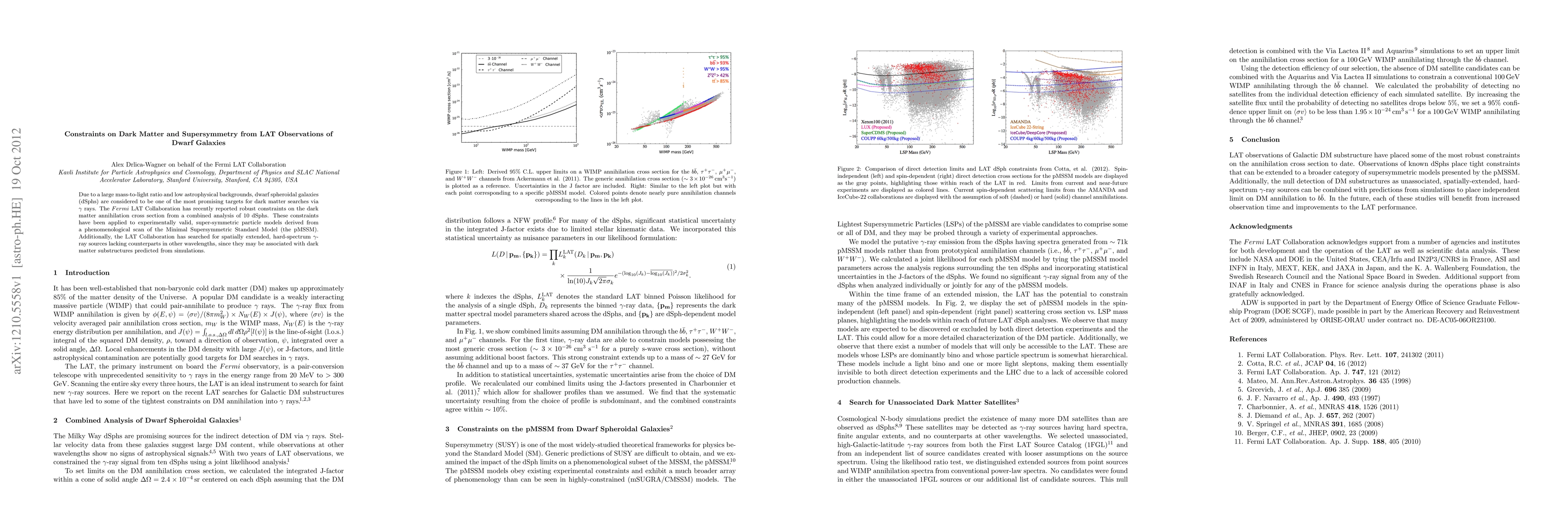 This paper reports constraints on dark matter and supersymmetry from Fermi LAT observations of 10 dwarf spheroidal galaxies, providing robust limits on the dark matter annihilation cross section and testing super-symmetric particle models derived from the pMSSM. Additionally, the study searched for extended gamma-ray sources potentially linked to dark matter substructures.