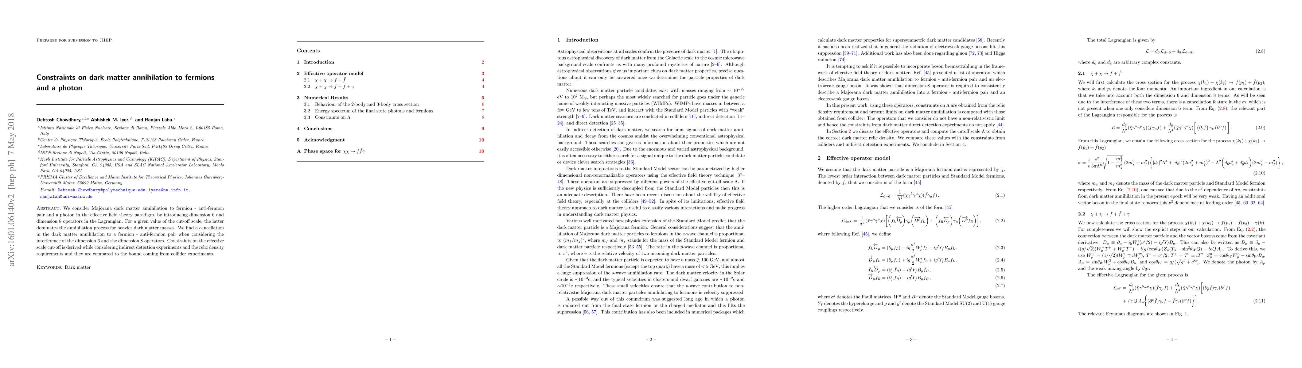 This paper investigates Majorana dark matter annihilation to fermion-antifermion pairs and a photon using effective field theory, focusing on dimension 6 and 8 operators. It finds that for heavier dark matter, dimension 8 operators dominate, and reveals a cancellation effect in the annihilation process. Constraints on the effective scale cut-off are derived from indirect detection and relic density, compared with collider bounds.