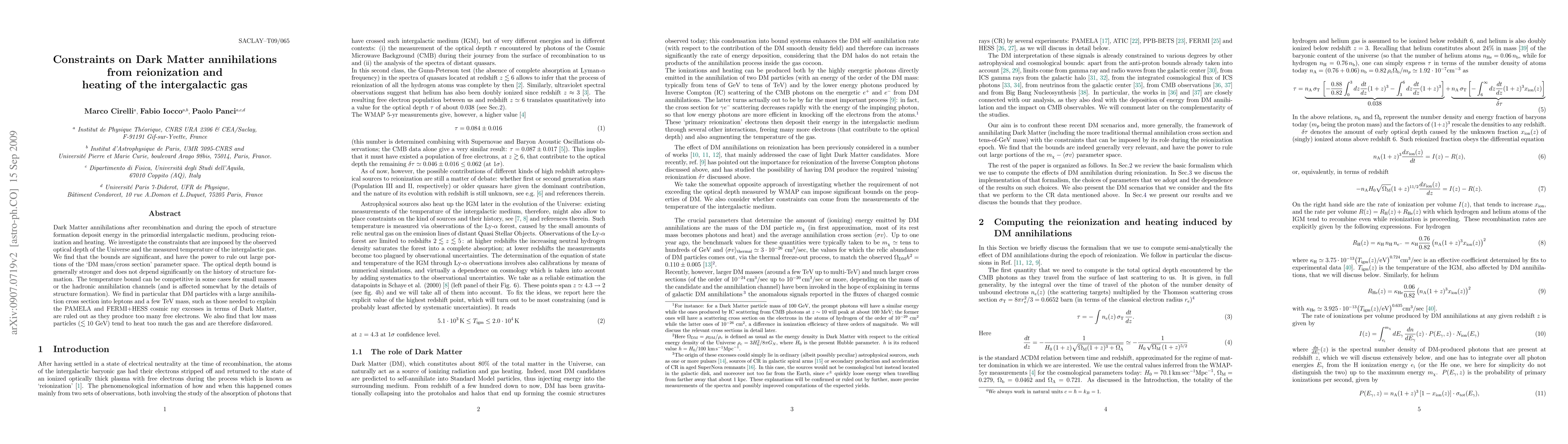 Dark Matter annihilations after recombination and during the epoch of structure formation deposit energy in the primordial intergalactic medium, producing reionization and heating. We investigate the constraints that are imposed by the observed optical depth of the Universe and the measured temperature of the intergalactic gas. We find that the bounds are significant, and have the power to rule out large portions of the `DM mass/cross section' parameter space. The optical depth bound is generally stronger and does not depend significantly on the history of structure formation. The temperature bound can be competitive in some cases for small masses or the hadronic annihilation channels (and is affected somewhat by the details of structure formation). We find in particular that DM particles with a large annihilation cross section into leptons and a few TeV mass, such as those needed to explain the PAMELA and FERMI+HESS cosmic ray excesses in terms of Dark Matter, are ruled out as they produce too many free electrons. We also find that low mass particles (<~ 10 GeV) tend to heat too much the gas and are therefore disfavored.