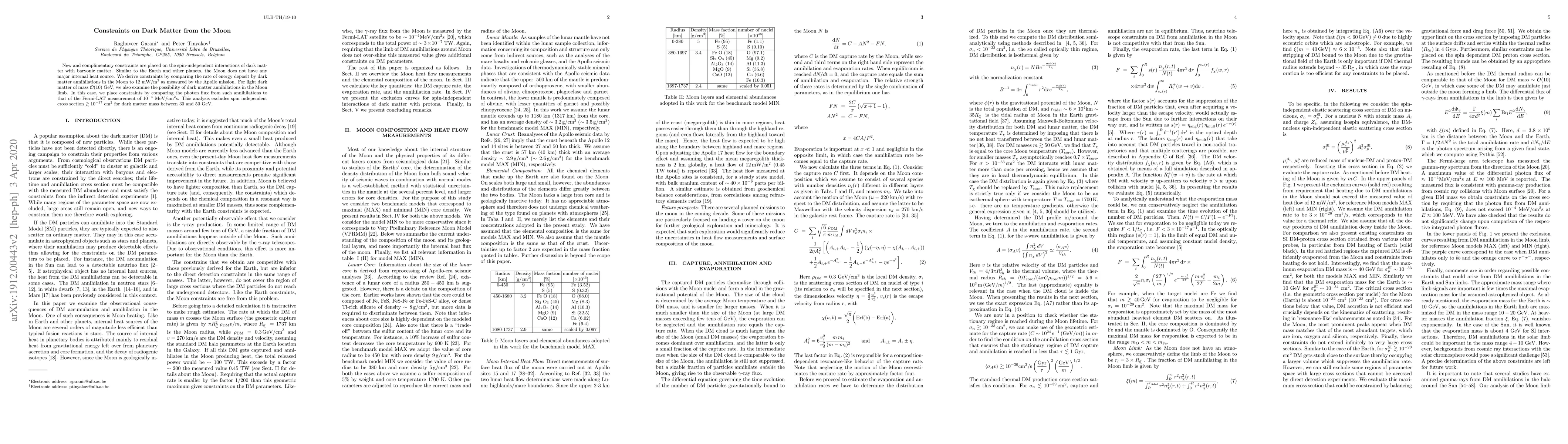 New and complimentary constraints are placed on the spin-independent interactions of dark matter with baryonic matter. Similar to the Earth and other planets, the Moon does not have any major internal heat source. We derive constraints by comparing the rate of energy deposit by dark matter annihilations in the Moon to 12 mW/m$^2$ as measured by the Apollo mission. For light dark matter of mass $\mathcal{O}(10)$ GeV, we also examine the possibility of dark matter annihilations in the Moon limb. In this case, we place constraints by comparing the photon flux from such annihilations to that of the Fermi-LAT measurement of $10^{-4}$ MeV/cm$^2$s. This analysis excludes spin independent cross section $\gtrsim 10^{-37}$ $\rm{cm}^2$ for dark matter mass between 30 and 50 GeV.