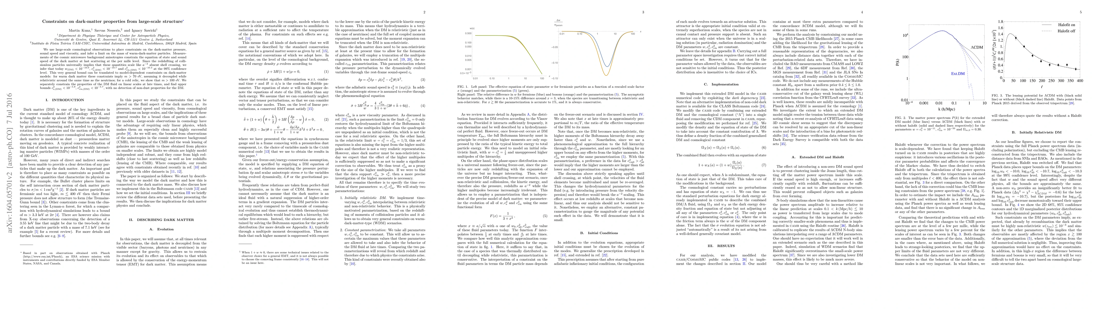 This paper uses large-scale cosmological observations to constrain dark-matter properties, finding $w_{\rm (DM)}< 10^{-10.0}$, $c_{\rm s,(DM)}^2 < 10^{-10.7}$, and $c_{\rm vis, (DM)}^{2} < 10^{-10.3}$ at the 99% confidence level, implying $m> 70$ eV for warm dark matter and $m>100$ eV for cold dark matter.