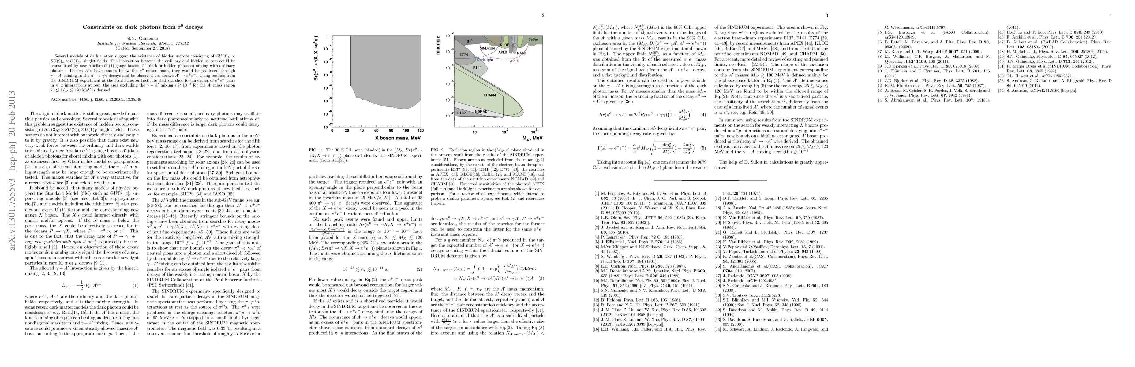 This research derives constraints on dark photons, hypothetical light gauge bosons from hidden sectors mixing with ordinary photons, using data from the SINDRUM experiment. By analyzing the pi0 -> 2gamma decays and excluding excess e+e- pairs, it establishes a limit of epsilon < 10^-3 for dark photon-photon mixing in the mass range of 25 to 120 MeV.