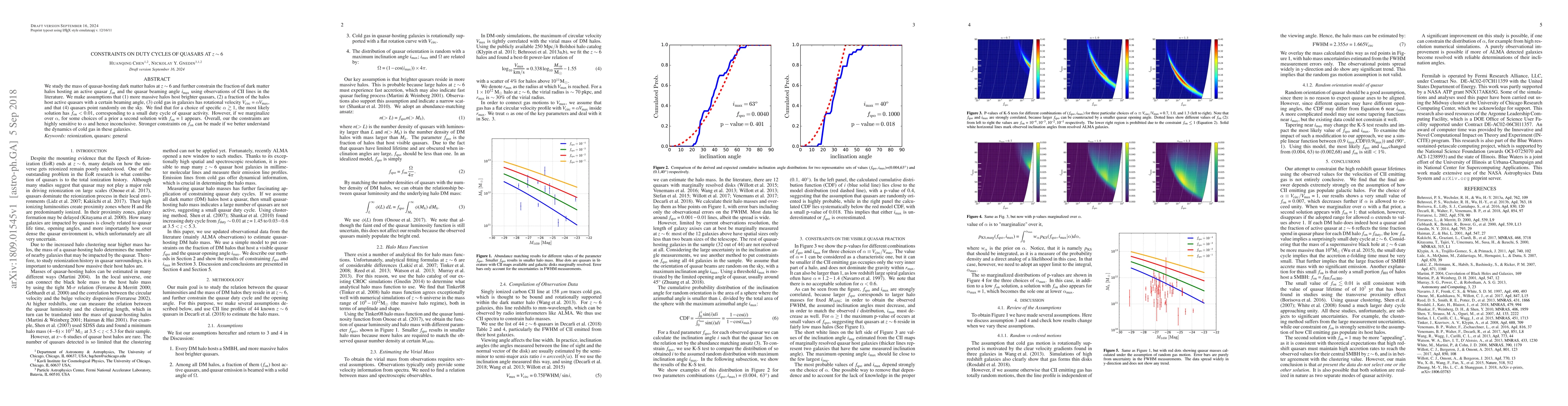 The study uses observations of CII lines in quasar-hosting galaxies at z ~ 6, assuming that more massive halos host brighter quasars, a fraction of halos host active quasars with a certain beaming angle, cold gas in galaxies has rotational velocity V_circ = αV_max, and quasars point randomly on the sky. Abundance matching is employed to relate quasar luminosity to dark matter halo mass.