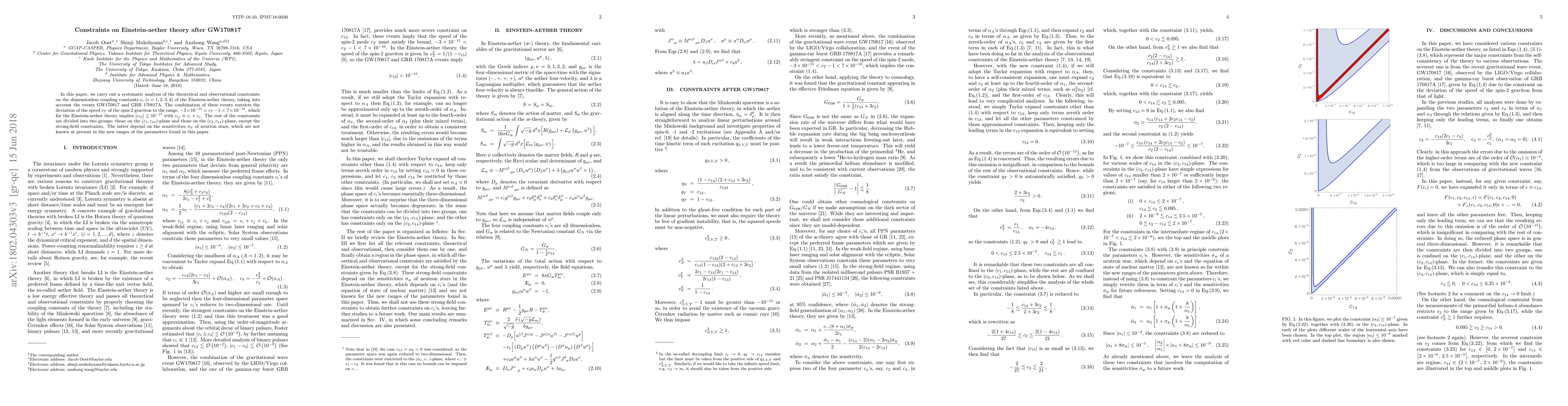 This paper analyzes the constraints on Einstein-aether theory's coupling constants using the GW170817 event and finds that the speed of the spin-2 graviton is constrained to a narrow range, implying $\left|c_{13}\right| \le 10^{-15}$. The remaining constraints are categorized based on the ($c_1, c_{14}$) and ($c_2, c_{14}$) planes, with strong-field constraints pending neutron star sensitivity data.