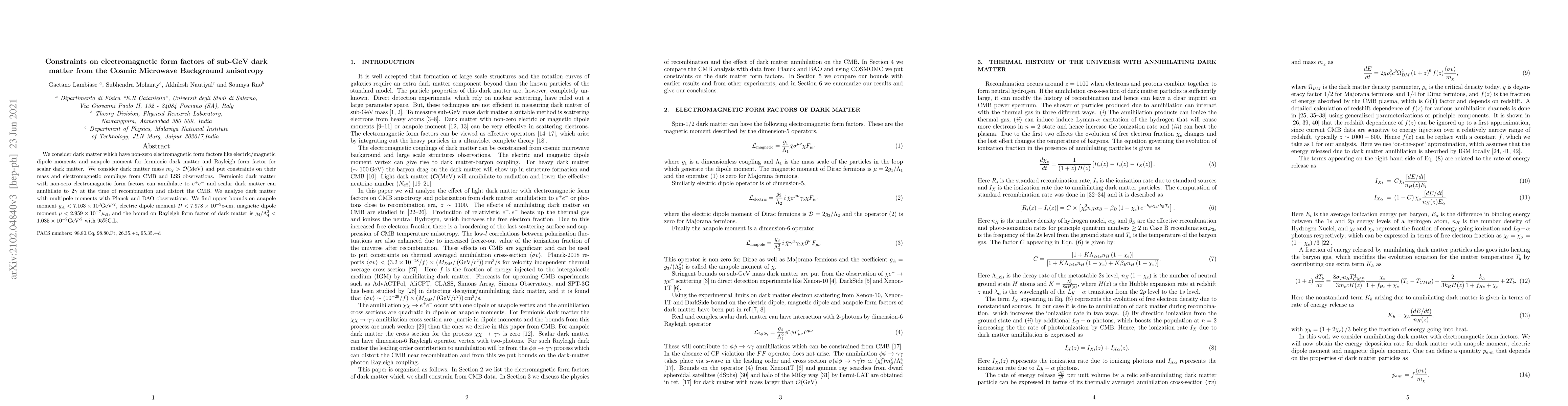 This paper constrains the electromagnetic form factors of sub-GeV dark matter, including electric/magnetic dipole moments and anapole moments for fermions, and the Rayleigh form factor for scalars, using CMB and LSS observations. It finds upper bounds on these form factors, including $g_{A}<7.163\times 10^{3} \text{GeV}^{-2}$ for the anapole moment and ${\cal D}<7.978\times 10^{-9} \text{e-cm}$ for the electric dipole moment.