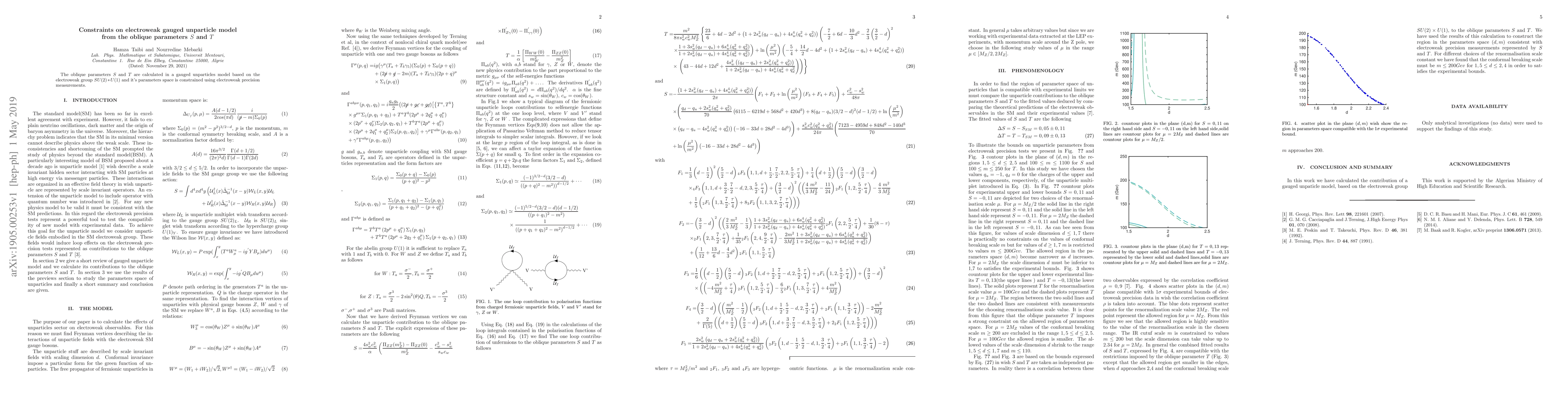 The oblique parameters $S$ and $T$ are calculated in a gauged unparticles model based on the electroweak group $SU(2)*U(1)$ and it's parameters space is constrained using electroweak precision measurements.