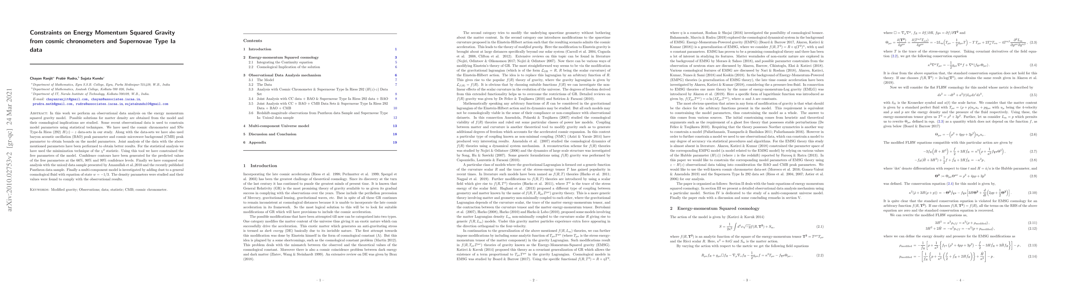 In this work we perform an observational data analysis on the energy momentum squared gravity model. Possible solutions for matter density are obtained from the model and their cosmological implications are studied. Some recent observational data is used to constrain model parameters using statistical techniques. We have used the cosmic chronometer and SNe Type-Ia Riess (292) $H(z)-z$ data-sets in our study. Along with the data-sets we have also used baryon acoustic oscillation (BAO) peak parameter and cosmic microwave background (CMB) peak parameter to obtain bounds on the model parameters. Joint analysis of the data with the above mentioned parameters have been performed to obtain better results. For the statistical analysis we have used the minimization technique of the $\chi^{2}$ statistic. Using this tool we have constrained the free parameters of the model. Confidence contours have been generated for the predicted values of the free parameters at the $66\%$, $90\%$ and $99\%$ confidence levels. Finally we have compared our analysis with the union2 data sample presented by Amanullah et al.,2010 and the recently published Pantheon data sample. Finally a multi-component model is investigated by adding dust to a general cosmological fluid with equation of state $w=-1/3$. The density parameters were studied and their values were found to comply with the observational results.