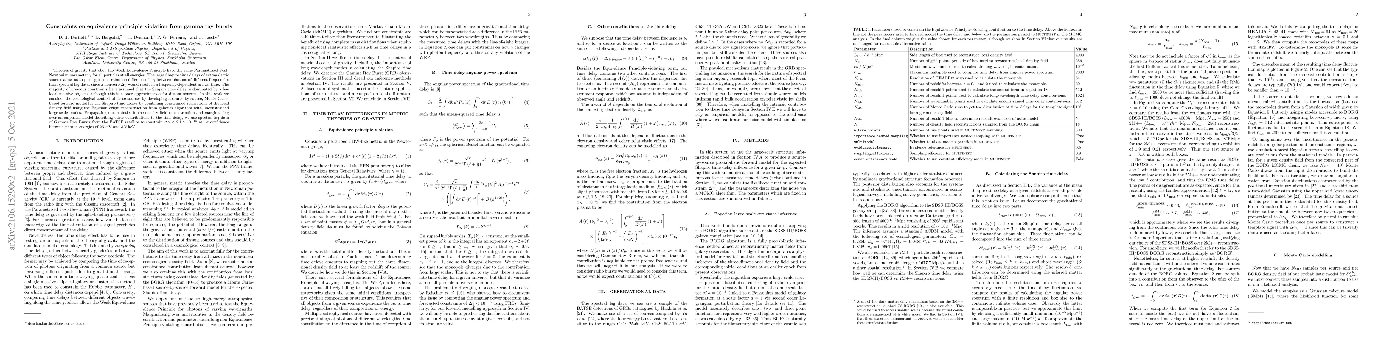 Theories of gravity that obey the Weak Equivalence Principle have the same Parametrised Post-Newtonian parameter $\gamma$ for all particles at all energies. The large Shapiro time delays of extragalactic sources allow us to put tight constraints on differences in $\gamma$ between photons of different frequencies from spectral lag data, since a non-zero $\Delta \gamma$ would result in a frequency-dependent arrival time. The majority of previous constraints have assumed that the Shapiro time delay is dominated by a few local massive objects, although this is a poor approximation for distant sources. In this work we consider the cosmological context of these sources by developing a source-by-source, Monte Carlo-based forward model for the Shapiro time delays by combining constrained realisations of the local density field using the Bayesian origin reconstruction from galaxies algorithm with unconstrained large-scale modes. Propagating uncertainties in the density field reconstruction and marginalising over an empirical model describing other contributions to the time delay, we use spectral lag data of Gamma Ray Bursts from the BATSE satellite to constrain $\Delta \gamma < 2.1 \times 10^{-15}$ at $1 \sigma$ confidence between photon energies of $25 {\rm \, keV}$ and $325 {\rm \, keV}$.