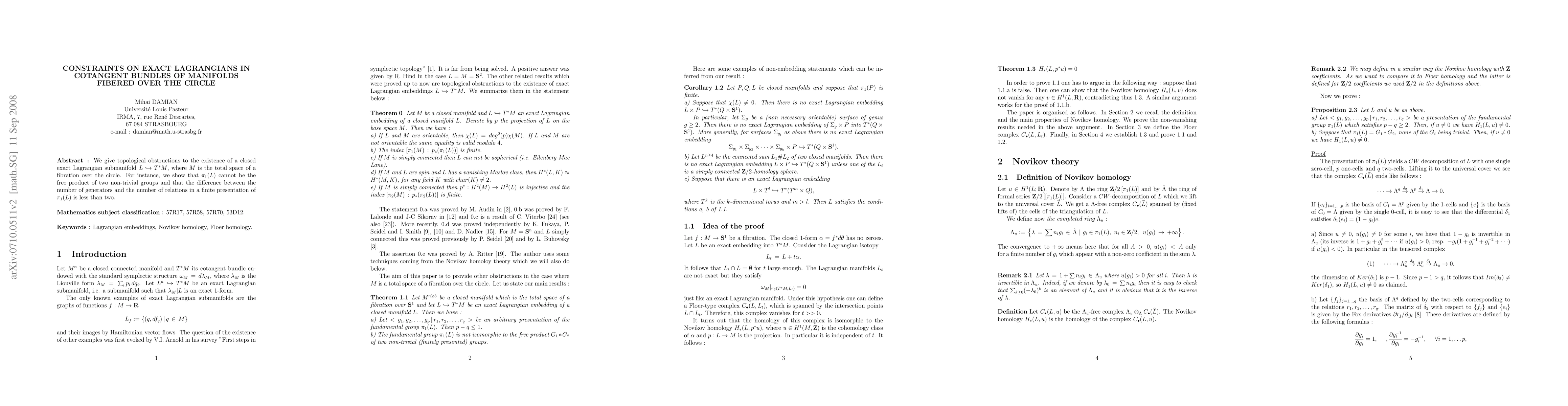 We give topological obstructions to the existence of a closed exact Lagrangian submanifold in the cotangent bundle of a closed manifold M which is the total space of a fibration over the circle. For instance we show that the fundamental group of such a Lagrangian submanifold cannot be the free product of two non-trivial groups and that in any finite presentation of this group the difference between the number of generators and the number of relations is less than two.