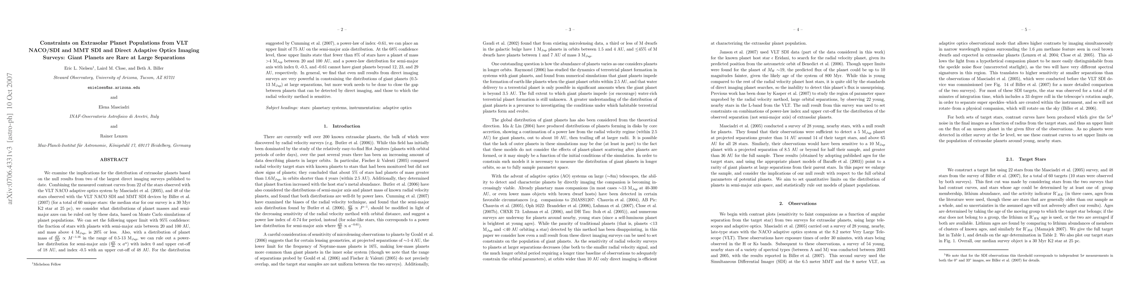 This study combines data from two large direct imaging surveys to constrain the distribution of giant extrasolar planets at large distances from their stars. Using Monte Carlo simulations, they find with 95% confidence that no more than 20% of stars host a Jupiter-mass planet (4 M_Jup) between 20 to 100 AU. They also rule out certain power-law distributions for semi-major axis, indicating that giant planets beyond specific distances are rare, with upper limits of 12 AU, 23 AU, and 29 AU for different distribution indices.