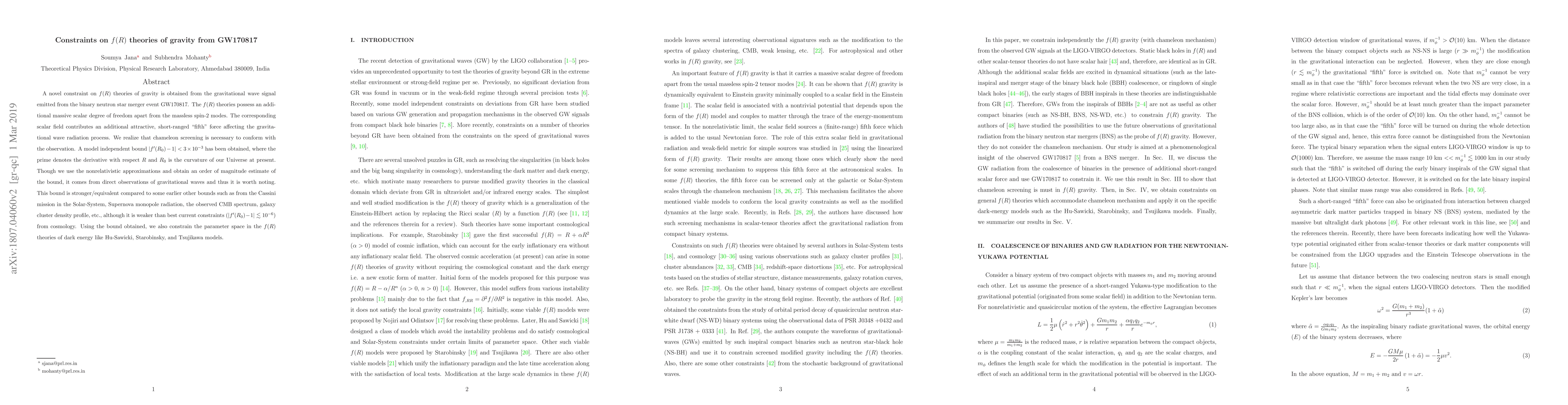 A novel constraint on $f(R)$ theories of gravity is obtained from the gravitational wave signal emitted from the binary neutron star merger event GW170817. The $f(R)$ theories possess an additional massive scalar degree of freedom apart from the massless spin-2 modes. The corresponding scalar field contributes an additional attractive, short-ranged "fifth" force affecting the gravitational wave radiation process. We realize that chameleon screening is necessary to conform with the observation. A model independent bound $\vert f'(R_0) -1\vert < 3\times 10^{-3}$ has been obtained, where the prime denotes the derivative with respect $R$ and $R_0$ is the curvature of our Universe at present. Though we use the nonrelativistic approximations and obtain an order of magnitude estimate of the bound, it comes from direct observations of gravitational waves and thus it is worth noting. This bound is stronger/equivalent compared to some earlier other bounds such as from the Cassini mission in the Solar-System, Supernova monopole radiation, the observed CMB spectrum, galaxy cluster density profile, etc., although it is weaker than best current constraints ($\vert f'(R_0) -1\vert \lesssim 10^{-6}$) from cosmology. Using the bound obtained, we also constrain the parameter space in the $f(R)$ theories of dark energy like Hu-Sawicki, Starobinsky, and Tsujikawa models.