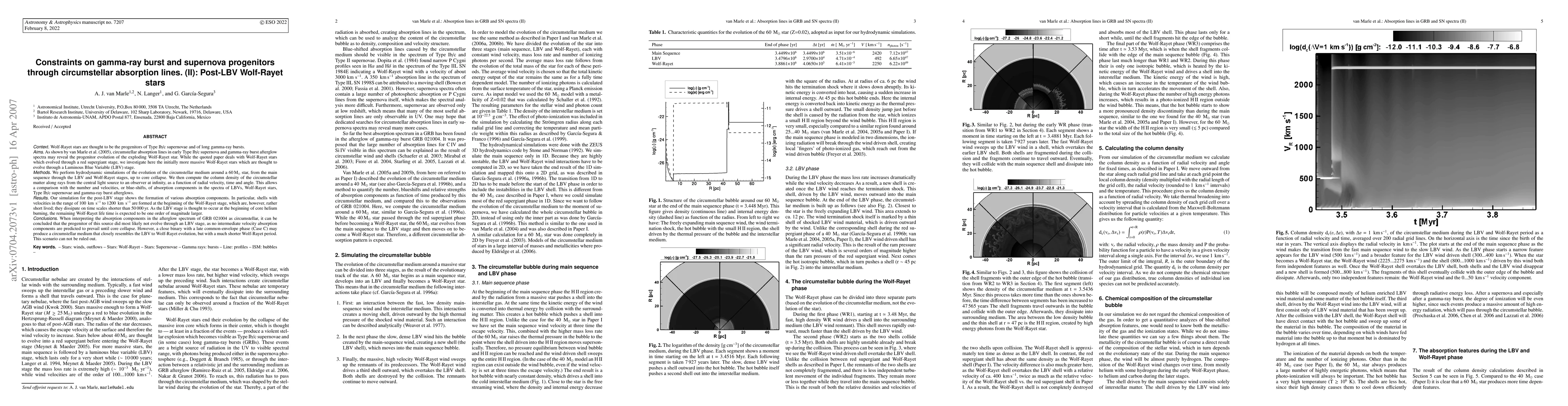 Van Marle et al. (2005) investigate the circumstellar absorption lines in spectra of post-LBV Wolf-Rayet stars, Type Ib/c supernovae, and gamma-ray burst afterglows to infer progenitor evolution. Their hydrodynamic simulations reveal short-lived absorption components, suggesting the progenitor of GRB-021004 likely did not evolve through an LBV stage, though binary systems may mimic such evolution.