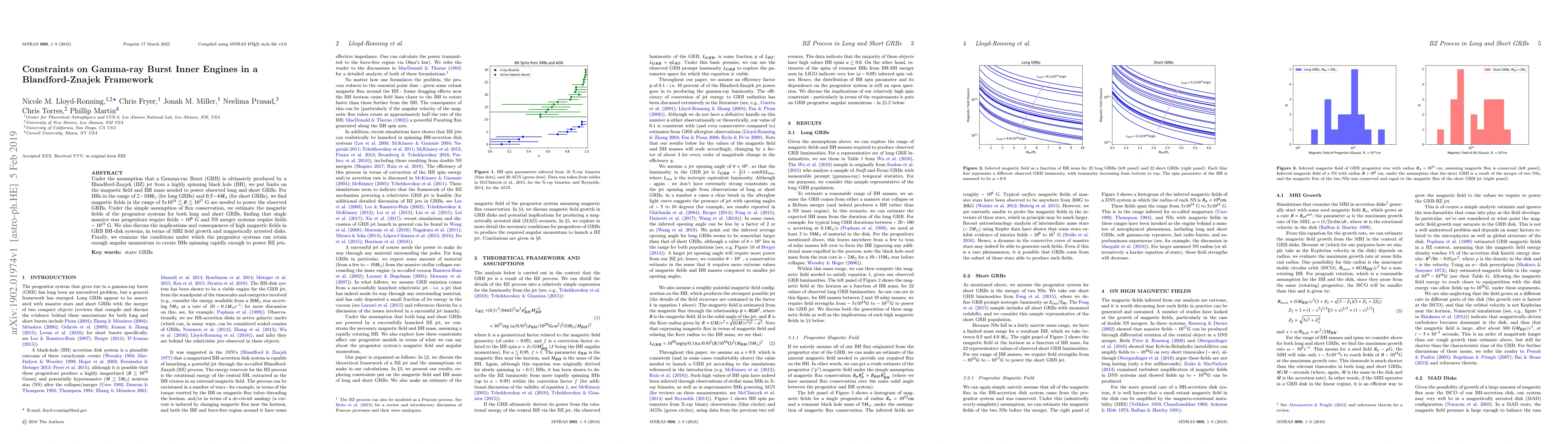 Under the assumption that a Gamma-ray Burst (GRB) is ultimately produced by a Blandford-Znajek (BZ) jet from a highly spinning black hole BH, we put limits on the magnetic field and BH mass needed to power observed long and short GRBs. For BHs in the range of $2-10 M_{\odot}$ (for long GRBs) and $0.5-4 M_{\odot}$ (for short GRBs), we find magnetic fields in the range of $5x10^{14} \lesssim B \lesssim 10^{17}$ G are needed to power the observed GRBs. Under the simple assumption of flux conservation, we estimate the magnetic fields of the progenitor systems for both long and short GRBs, finding that single massive star progenitors require fields $\sim 10^{6}$ G and NS merger systems require fields $\sim 10^{15}$ G. We also discuss the implications and consequences of high magnetic fields in GRB BH-disk systems, in terms of MRI field growth and magnetically arrested disks. Finally, we examine the conditions under which the progenitor systems can retain enough angular momentum to create BHs spinning rapidly enough to power BZ jets.