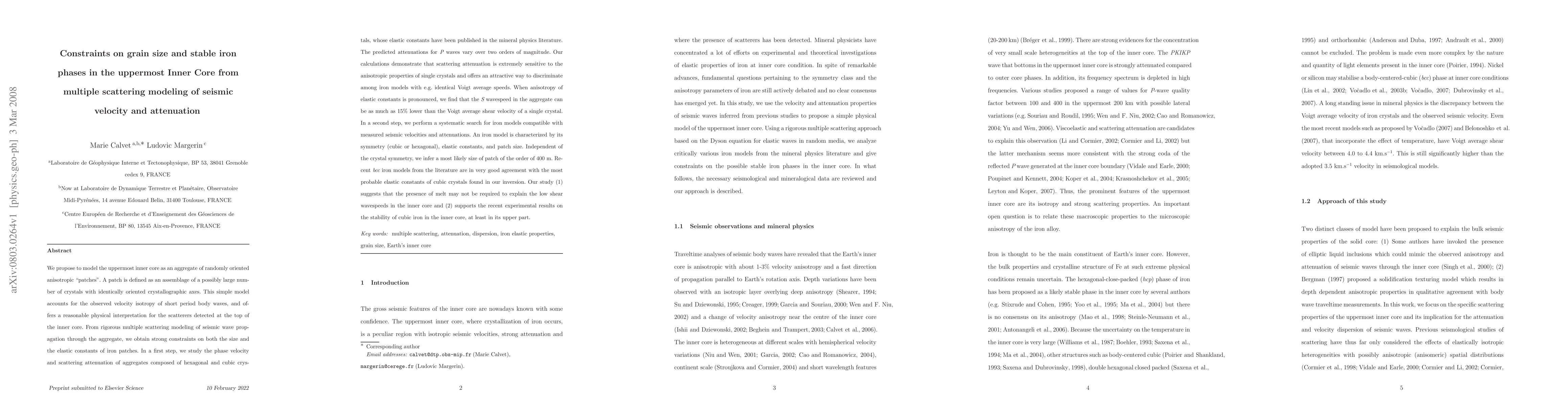 This study uses multiple scattering modeling to constrain grain size and stable iron phases in the uppermost inner core, finding patches of cubic iron with sizes around 400 m, suggesting melt may not be needed to explain low shear wavespeeds and supporting the stability of cubic iron.