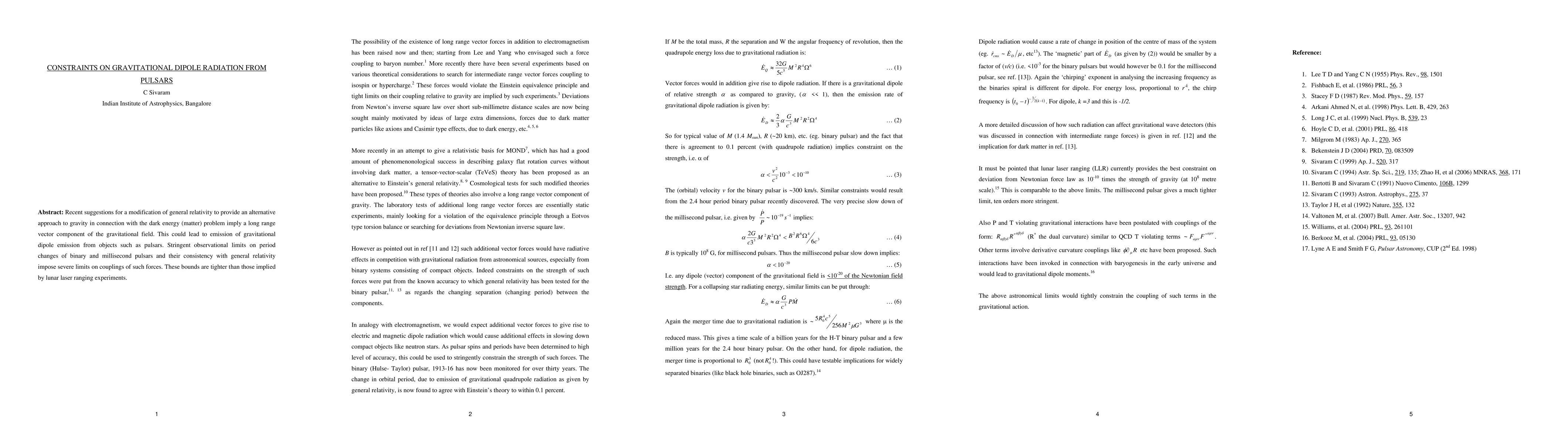 Recent studies of pulsars suggest that alternative approaches to gravity could lead to long-range vector components, potentially emitting gravitational dipole radiation. However, stringent observational limits impose severe constraints on such forces.