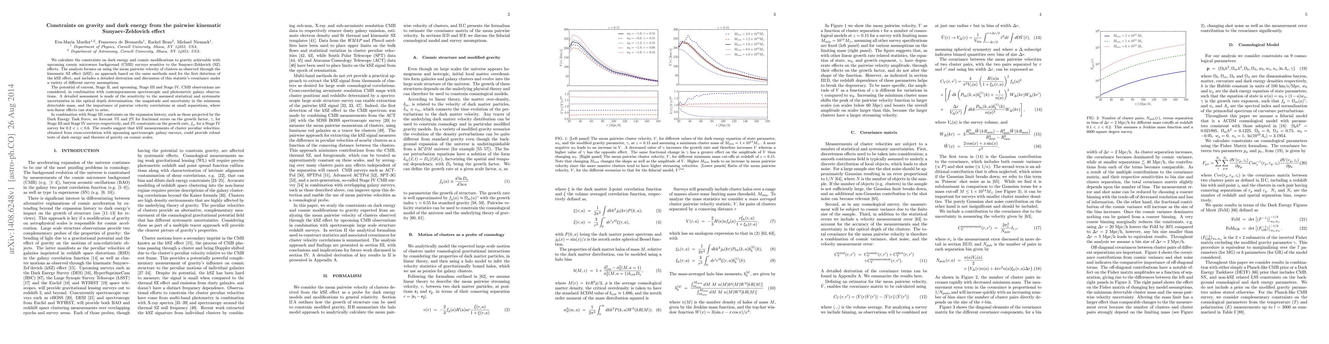 This paper investigates constraints on dark energy and modifications to gravity using the kinematic Sunyaev-Zeldovich (kSZ) effect from upcoming cosmic microwave background (CMB) surveys. It forecasts 5% and 2% fractional errors on the growth factor for Stage III and IV surveys, respectively, and 2% constraints on the growth rate for a Stage IV survey, suggesting robust tests of dark energy and gravity theories.