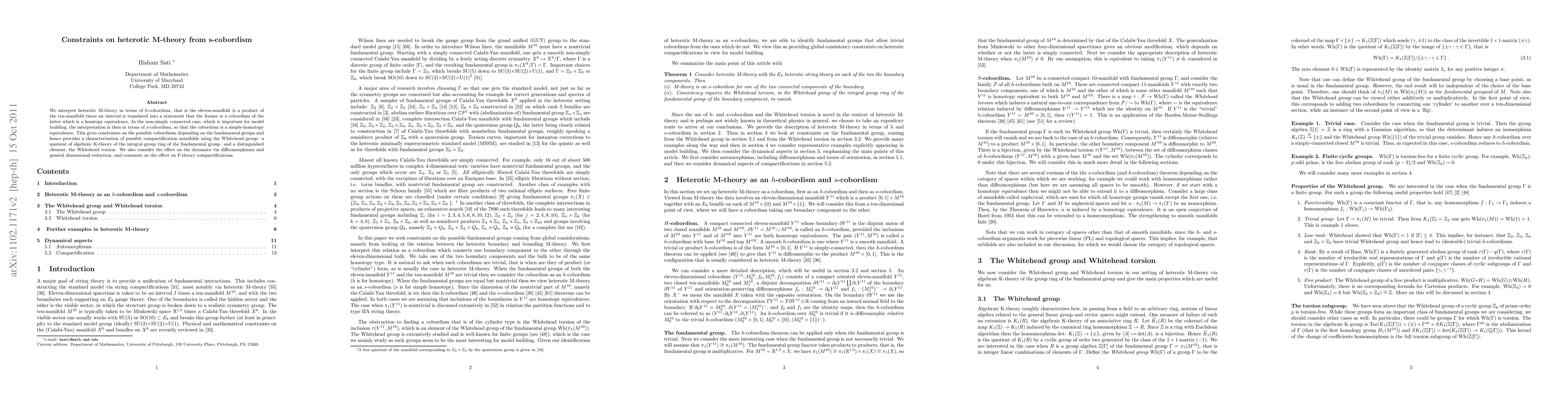We interpret heterotic M-theory in terms of h-cobordism, that is the eleven-manifold is a product of the ten-manifold times an interval is translated into a statement that the former is a cobordism of the latter which is a homtopy equivalence. In the non-simply connected case, which is important for model building, the interpretation is then in terms of s-cobordism, so that the cobordism is a simple-homotopy equivalence. This gives constraints on the possible cobordisms depending on the fundamental groups and hence provides a characterization of possible compactification manifolds using the Whitehead group-- a quotient of algebraic K-theory of the integral group ring of the fundamental group-- and a distinguished element, the Whitehead torsion. We also consider the effect on the dynamics via diffeomorphisms and general dimensional reduction, and comment on the effect on F-theory compactifications.