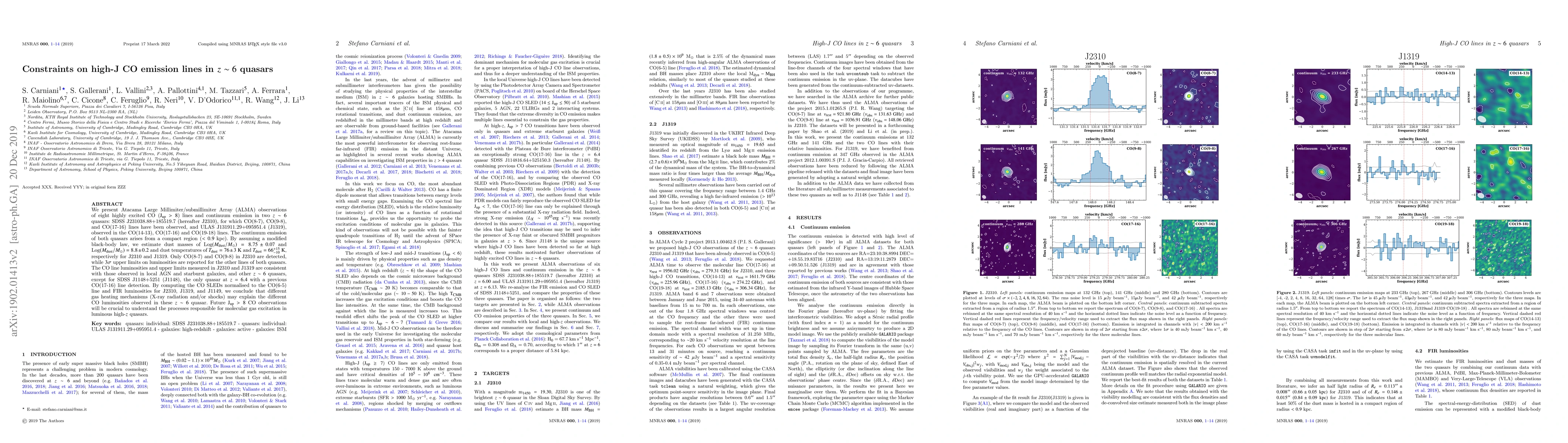 We present Atacama Large Millimiter/submillimiter Array (ALMA) observations of eight highly excited CO (J$_{\rm up}>8$) lines and continuum emission in two $z\sim6$ quasars: SDSS J231038.88+185519.7 (hereafter J2310), for which CO(8-7), CO(9-8), and CO(17-16) lines have been observed, and ULAS J131911.29+095951.4 (J1319), observed in the CO(14-13), CO(17-16) and CO(19-18) lines. The continuum emission of both quasars arises from a compact region ($< 0.9$ kpc). By assuming a modified black-body law, we estimate dust masses of Log$(M_{\rm dust}/M_{\odot})=8.75\pm0.07$ and Log$(M_{\rm dust}/M_{\odot})=8.8\pm0.2$ and dust temperatures of $T_{\rm dust}=76\pm3~{\rm K}$ and $T_{\rm dust}=66^{+15}_{-10}~{\rm K}$, respectively for J2310 and J1319. Only CO(8-7) and CO(9-8) in J2310 are detected, while $3\sigma$ upper limits on luminosities are reported for the other lines of both quasars. The CO line luminosities and upper limits measured in J2310 and J1319 are consistent with those observed in local AGN and starburst galaxies, and other $z\sim 6$ quasars, except for SDSS J1148+5251 (J1148), the only quasar at $z=6.4$ with a previous CO(17-16) line detection. By computing the CO SLEDs normalised to the CO(6-5) line and FIR luminosities for J2310, J1319, and J1149, we conclude that different gas heating mechanisms (X-ray radiation and/or shocks) may explain the different CO luminosities observed in these $z\sim6$ quasar. Future J$_{\rm up}>8$ CO observations will be crucial to understand the processes responsible for molecular gas excitation in luminous high-$z$ quasars.