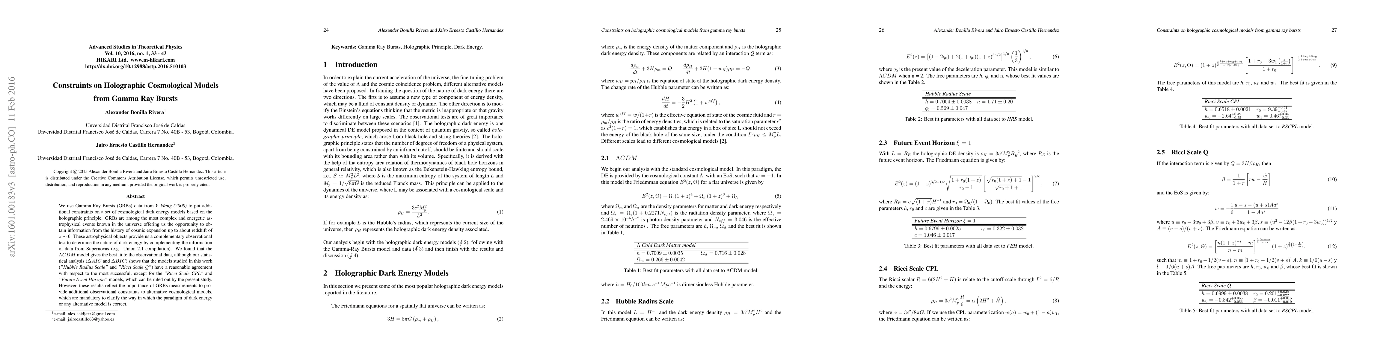 This paper uses Gamma Ray Bursts data to constrain holographic cosmological dark energy models, finding that the $\Lambda CDM$ model best fits the data. While other models show reasonable agreement, the "Ricci Scale CPL" and "Future Event Horizon" models are ruled out, highlighting the importance of GRBs for testing alternative cosmological models.