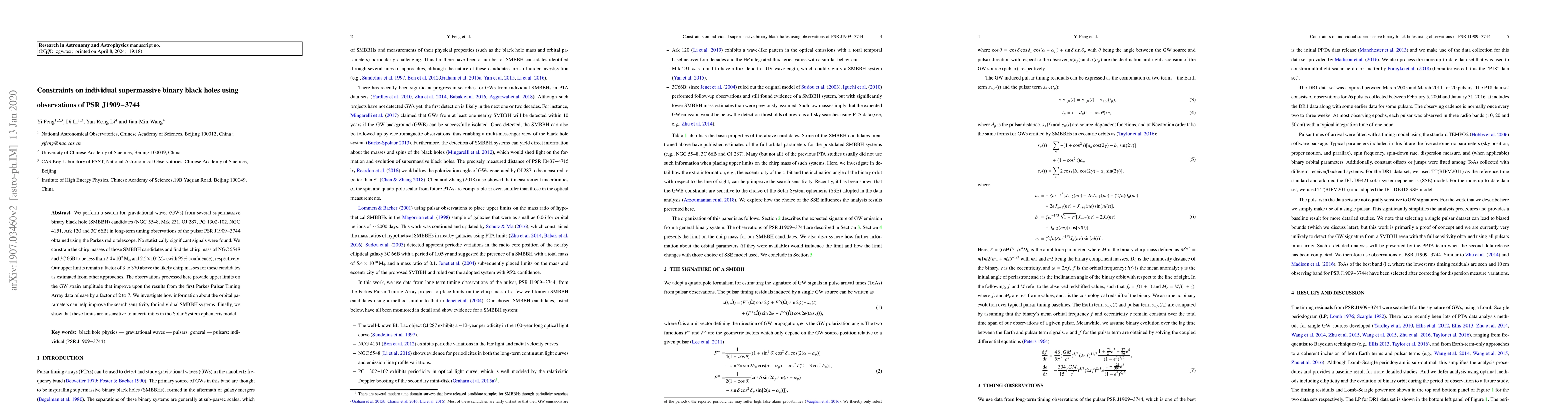 Researchers searched for gravitational waves from supermassive binary black holes using long-term pulsar timing observations and found no statistically significant signals, setting upper limits on the masses of individual black holes.
