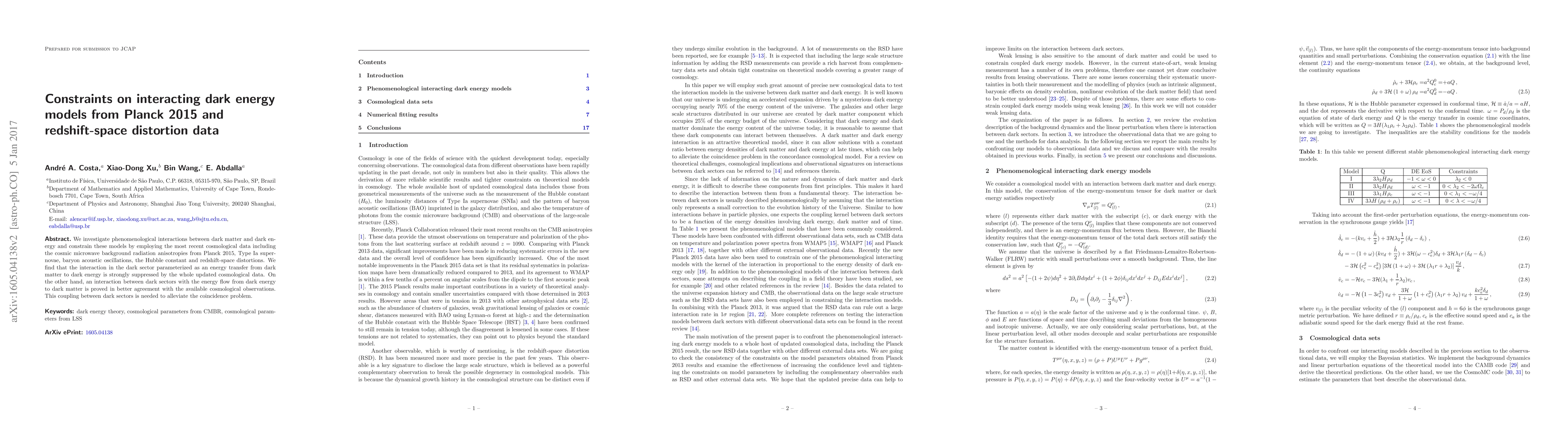 Researchers constrain interacting dark energy models using Planck 2015 and redshift-space distortion data, finding that an interaction with energy flow from dark energy to dark matter is in better agreement with observations.